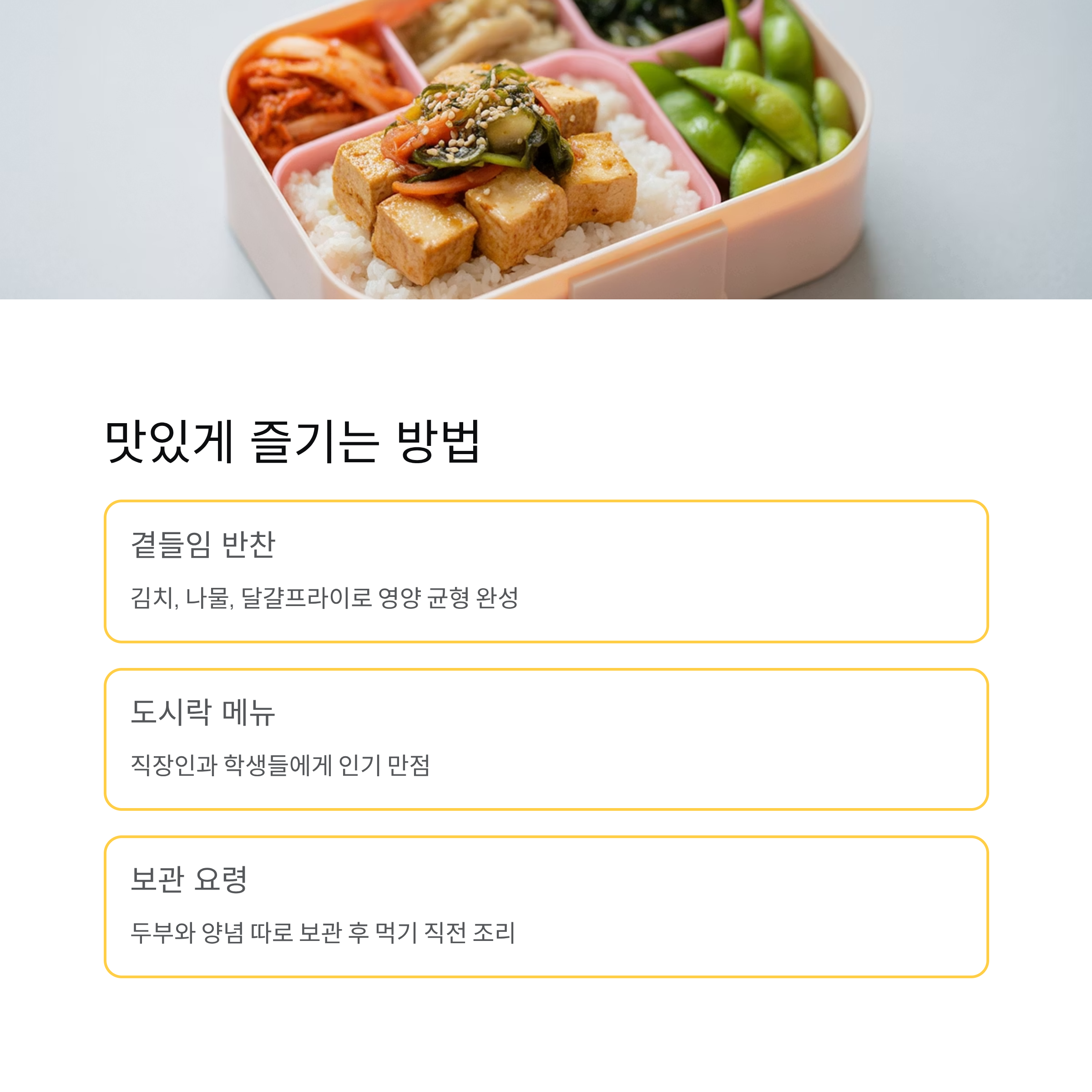 부득이하게 보관해야 한다면 두부와 양념을 따로 담아 냉장 보관하고, 먹기 직전에 밥에 올려 데우는 것이 좋습니다.