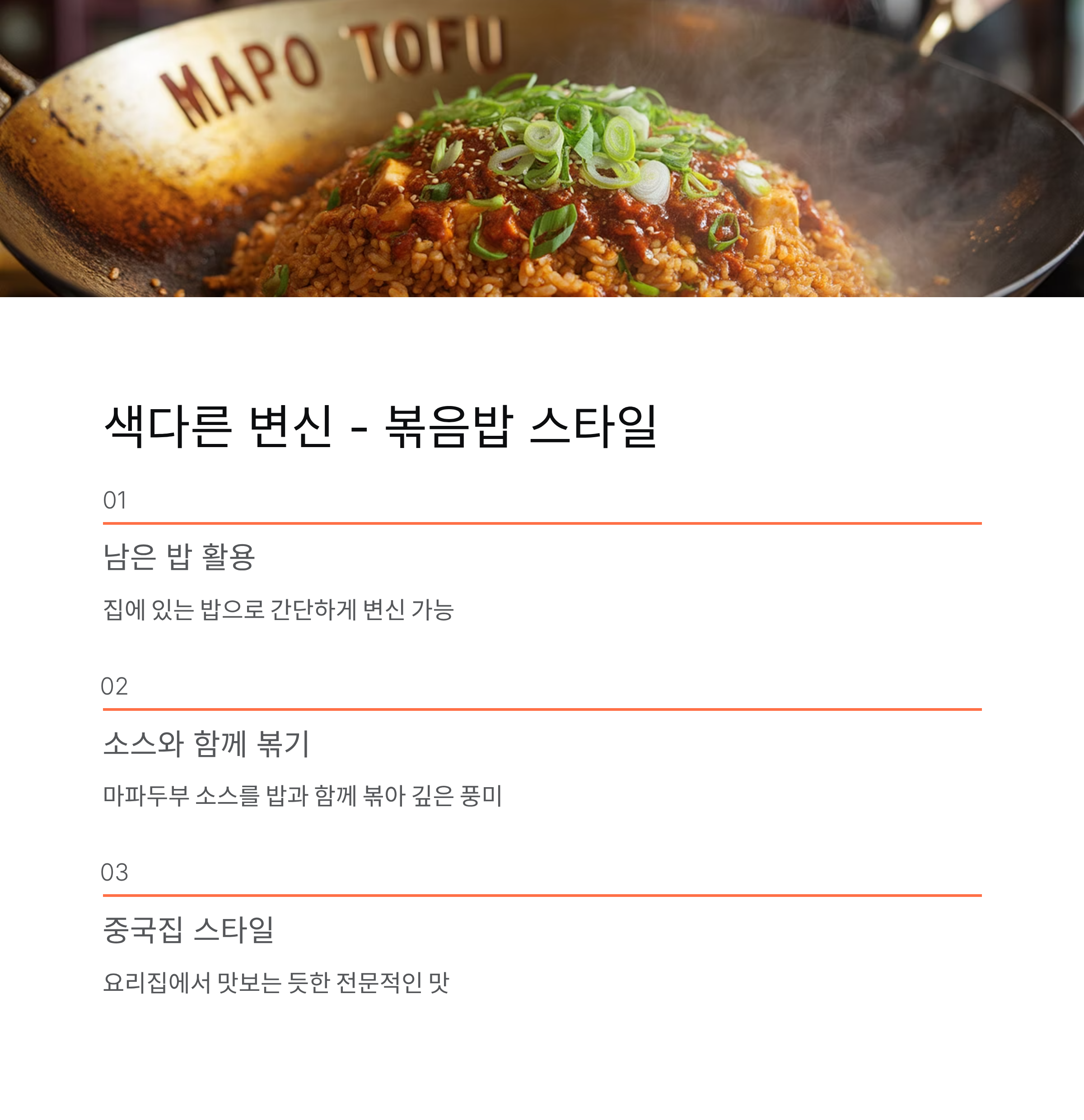 | 볶음밥 | 색다른 조리법 | 남은 밥 활용, 요리집 스타일 |