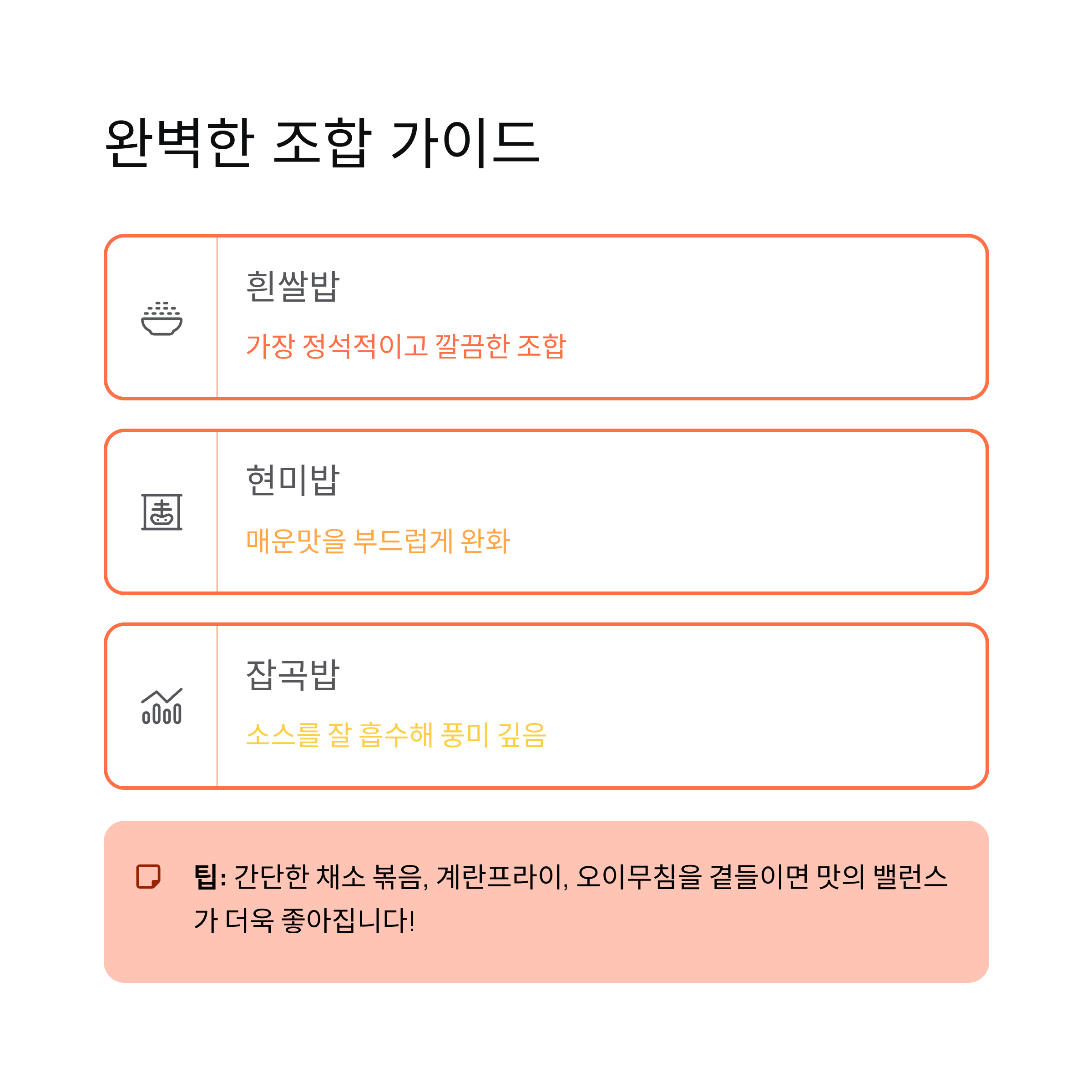 | 흰쌀밥 | 담백하고 고슬고슬 | 가장 정석적이고 깔끔한 조합 |