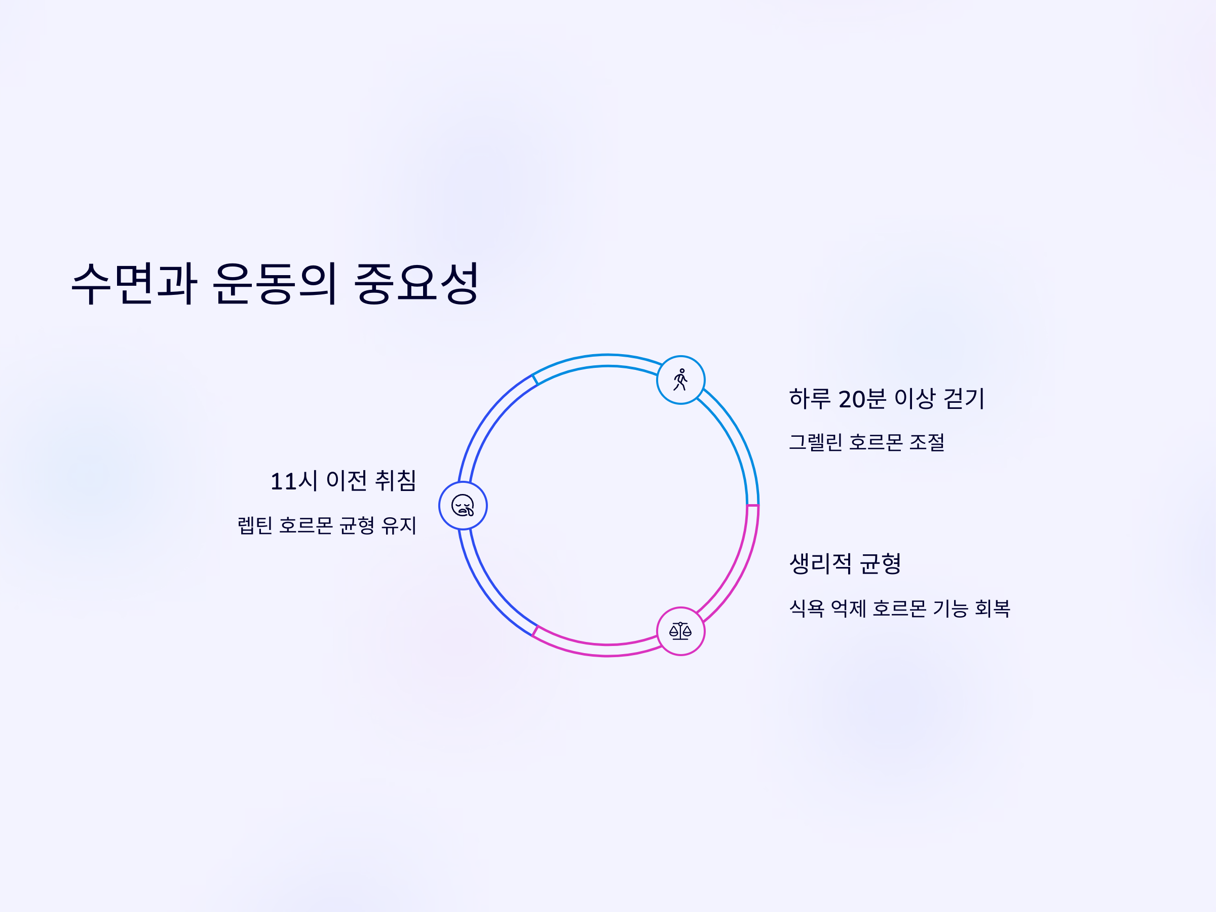 따라서 밤 11시 이전 취침, 하루 20분 이상 걷기만 실천해도 식욕 억제 호르몬이 제 기능을 하게 됩니다.