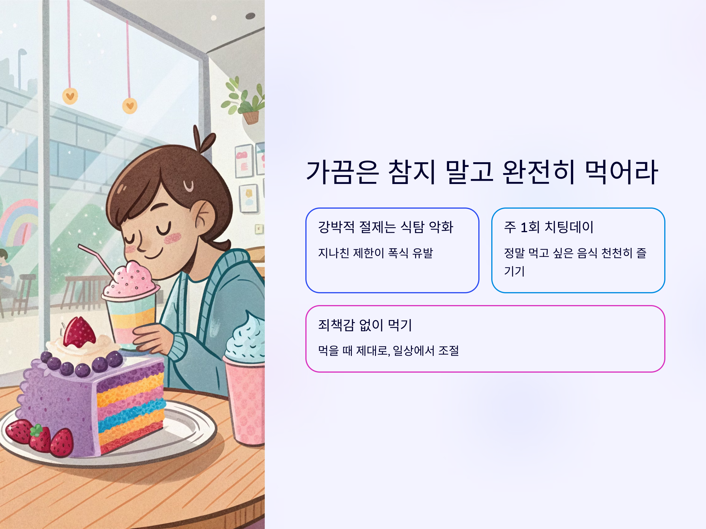 일주일에 한 번 정도는 “정말 먹고 싶은 음식”을 정하고 천천히, 죄책감 없이 먹는 연습도 필요합니다.