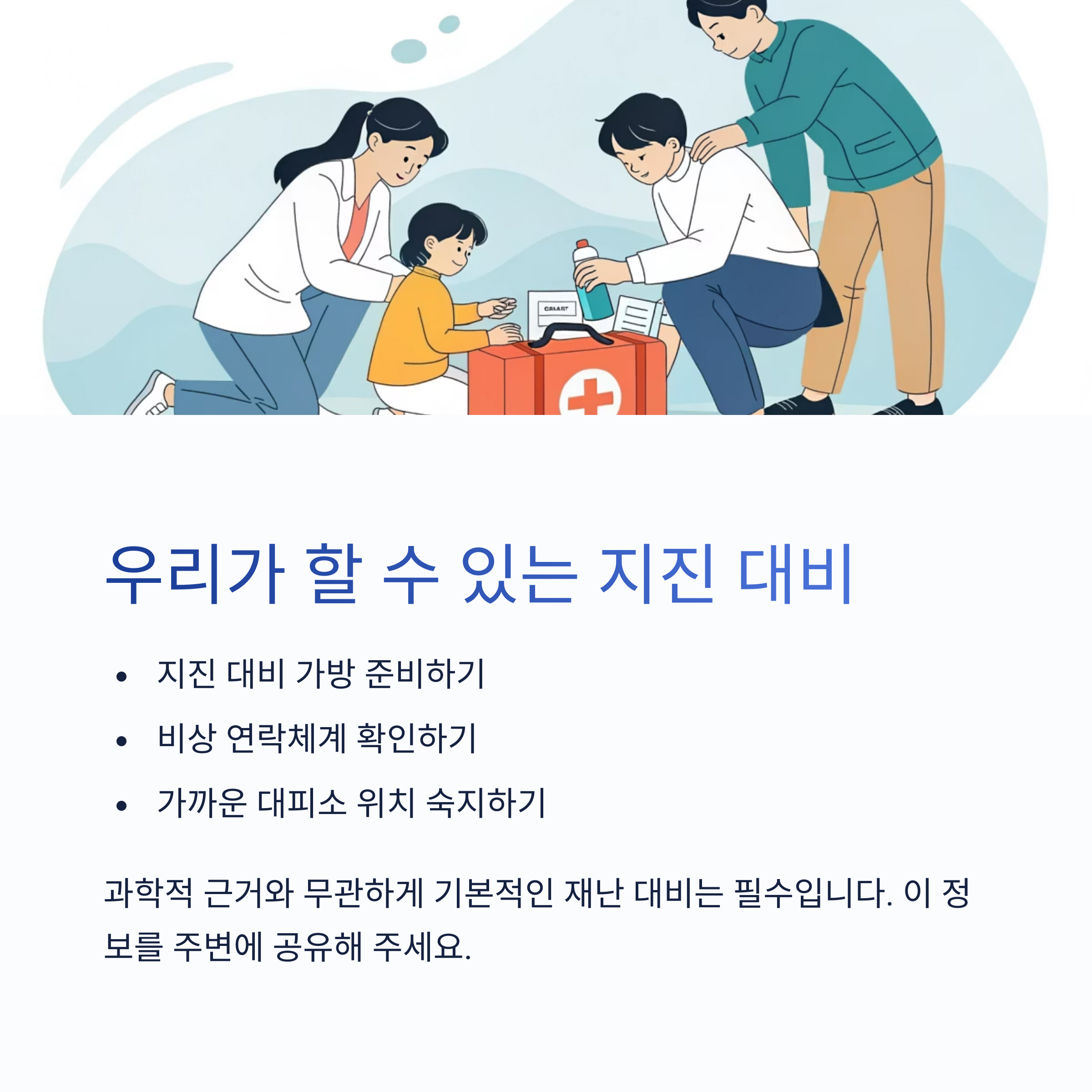 비상 연락체계 확인, 긴급 대피소 위치 숙지 등은
