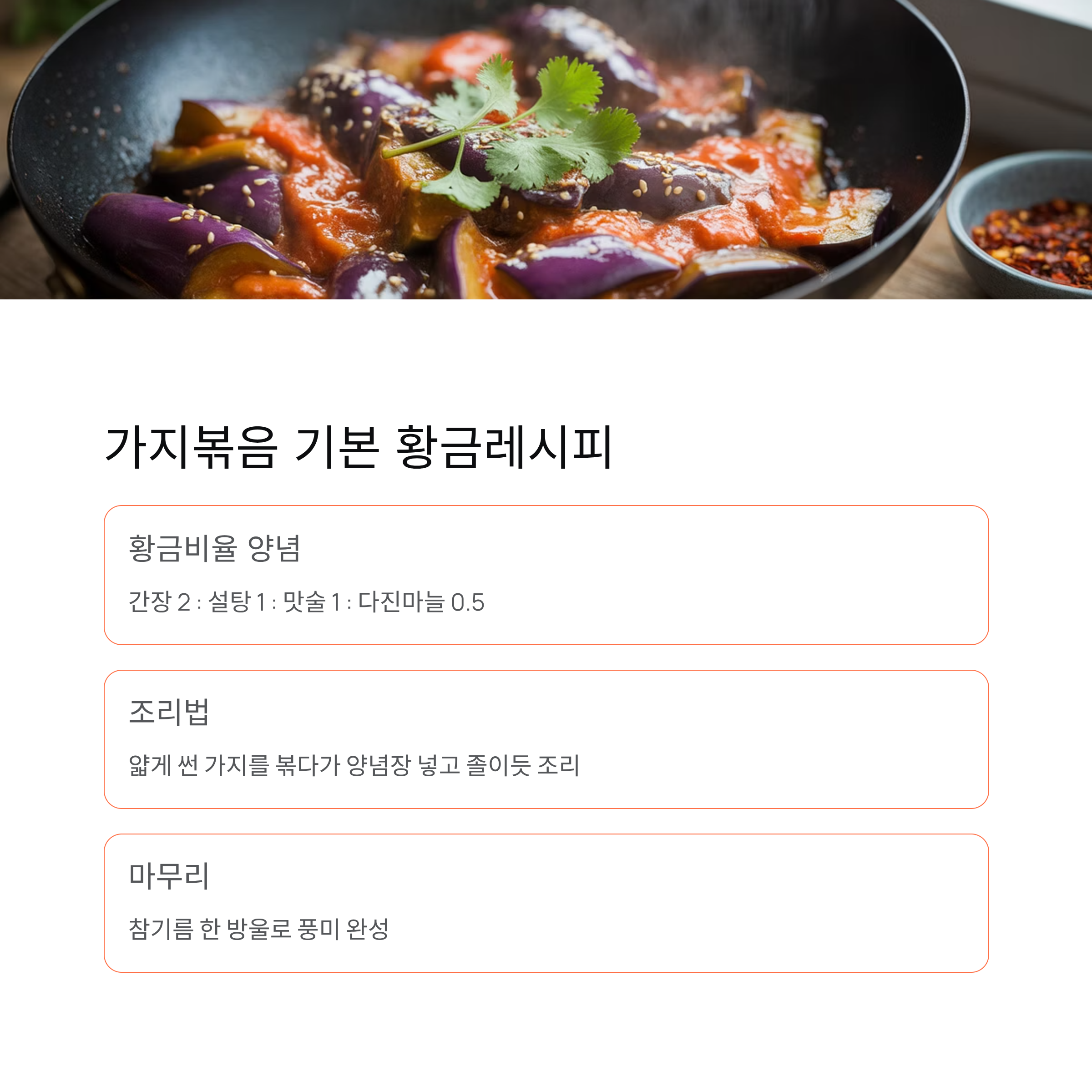 | 가지볶음 | 간장2, 설탕1, 맛술1, 마늘0.5 | 감칠맛과 윤기 |