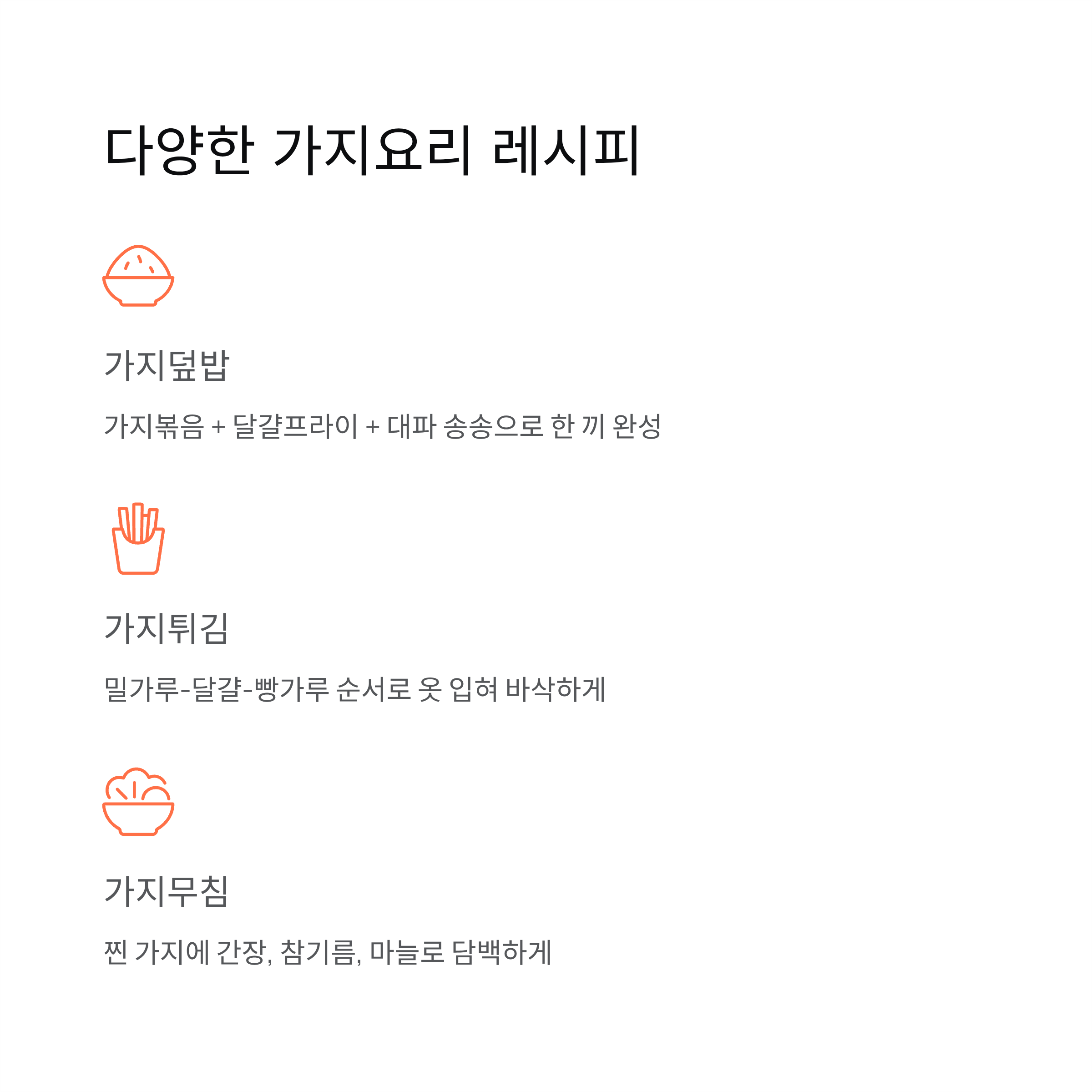 | 가지덮밥 | 볶음 + 달걀프라이 | 한 끼 식사 완성 |