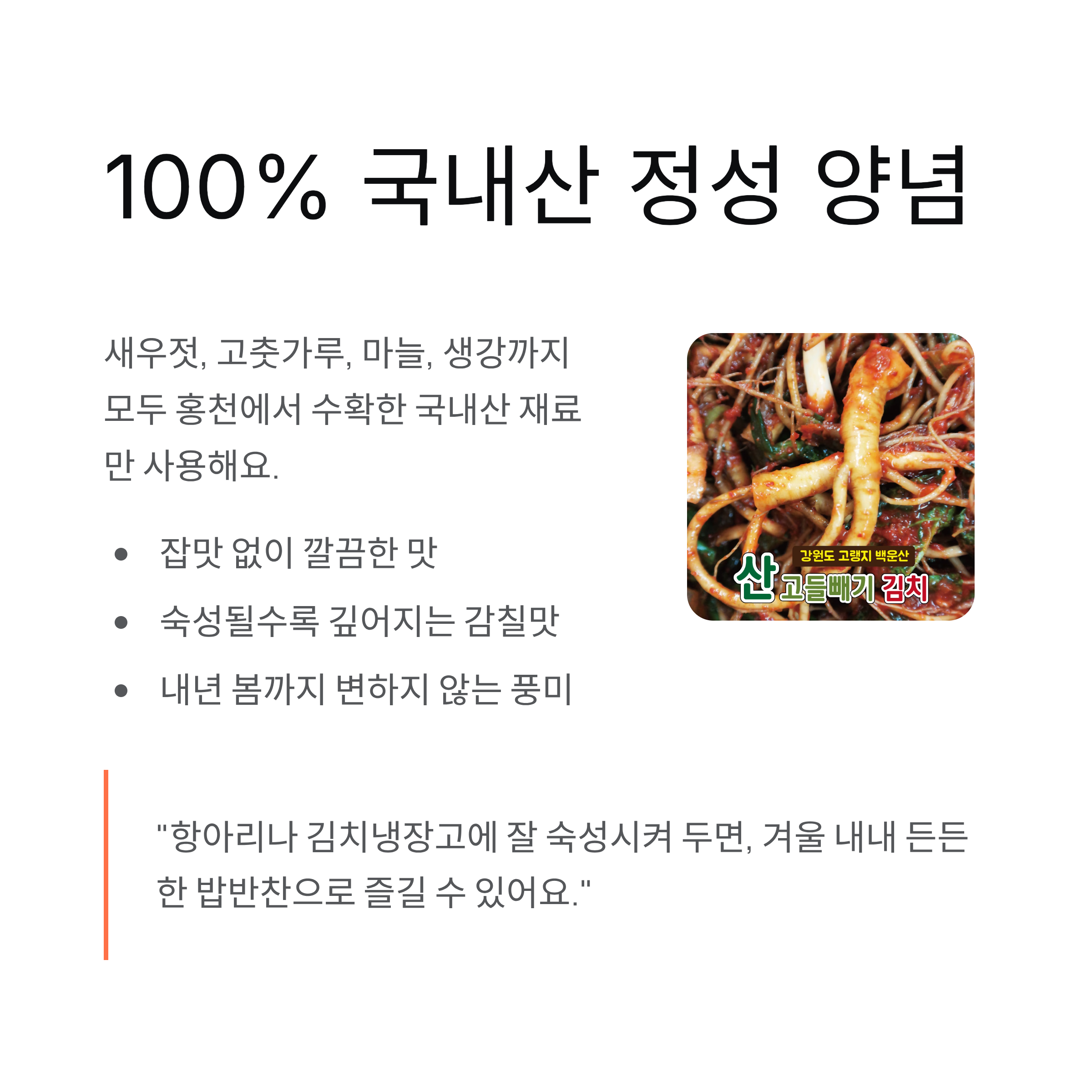 새우젓, 고춧가루, 마늘, 생강까지 모두 홍천에서 수확한 국내산 100% 재료로만 양념을 만들어요. 잡맛 없이 깔끔하고, 김치가 익을수록 맛이 깊어집니다. 바로 이 부분이 많은 분들이 찾는 이유죠.