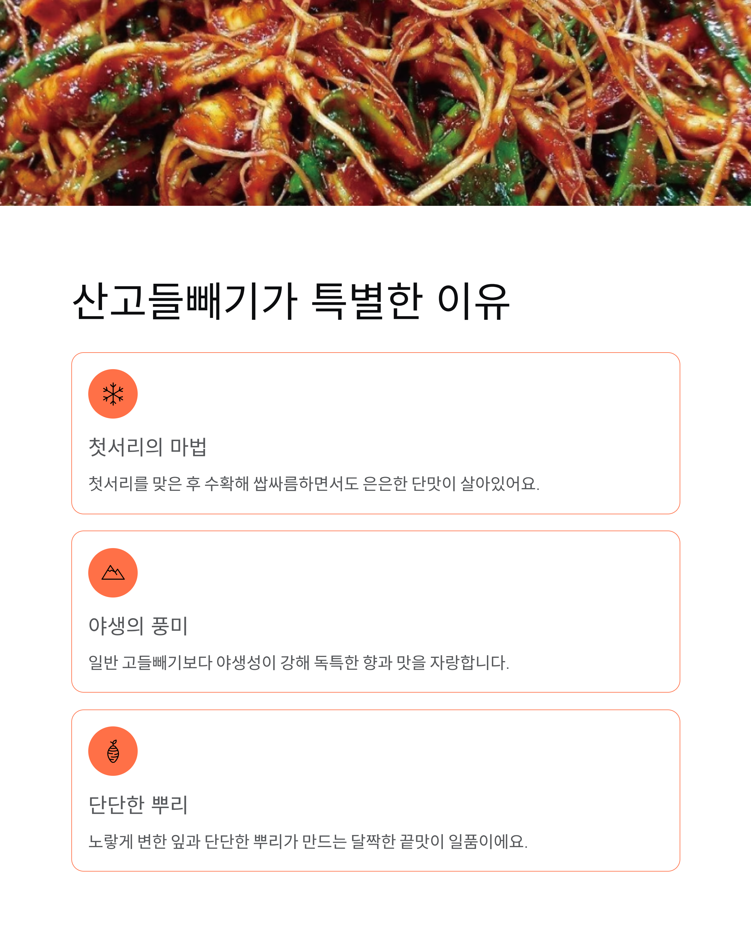 산고들빼기는 일반 고들빼기보다 야생성이 강하고, 첫서리를 맞은 후에 수확하기 때문에 독특한 풍미를 자랑해요. 잎은 노랗게 변하고 뿌리가 단단해져, 김치로 담갔을 때 특유의 쌉싸름한 맛과 달짝한 끝맛이 어우러집니다. 이 맛이 한 번 빠지면 정말 빠져나오기 힘들 정도예요.
