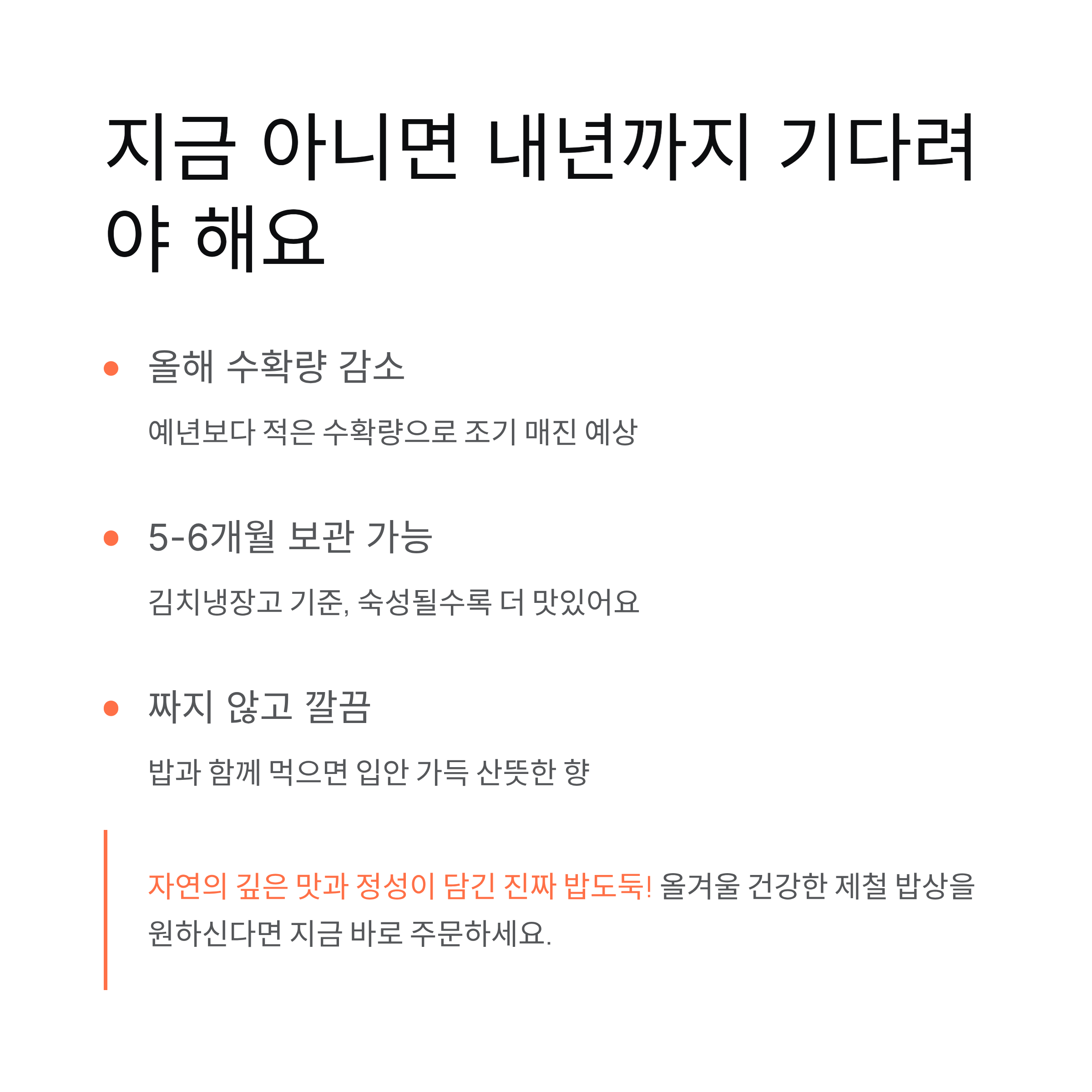 지금 담가두면 내년 봄까지 보관해도 맛이 변하지 않고 오히려 숙성되면서 감칠맛이 더 살아나요. 항아리나 김치냉장고에 잘 숙성시켜 두면, 겨울 내내 든든한 밥반찬으로 즐길 수 있습니다.