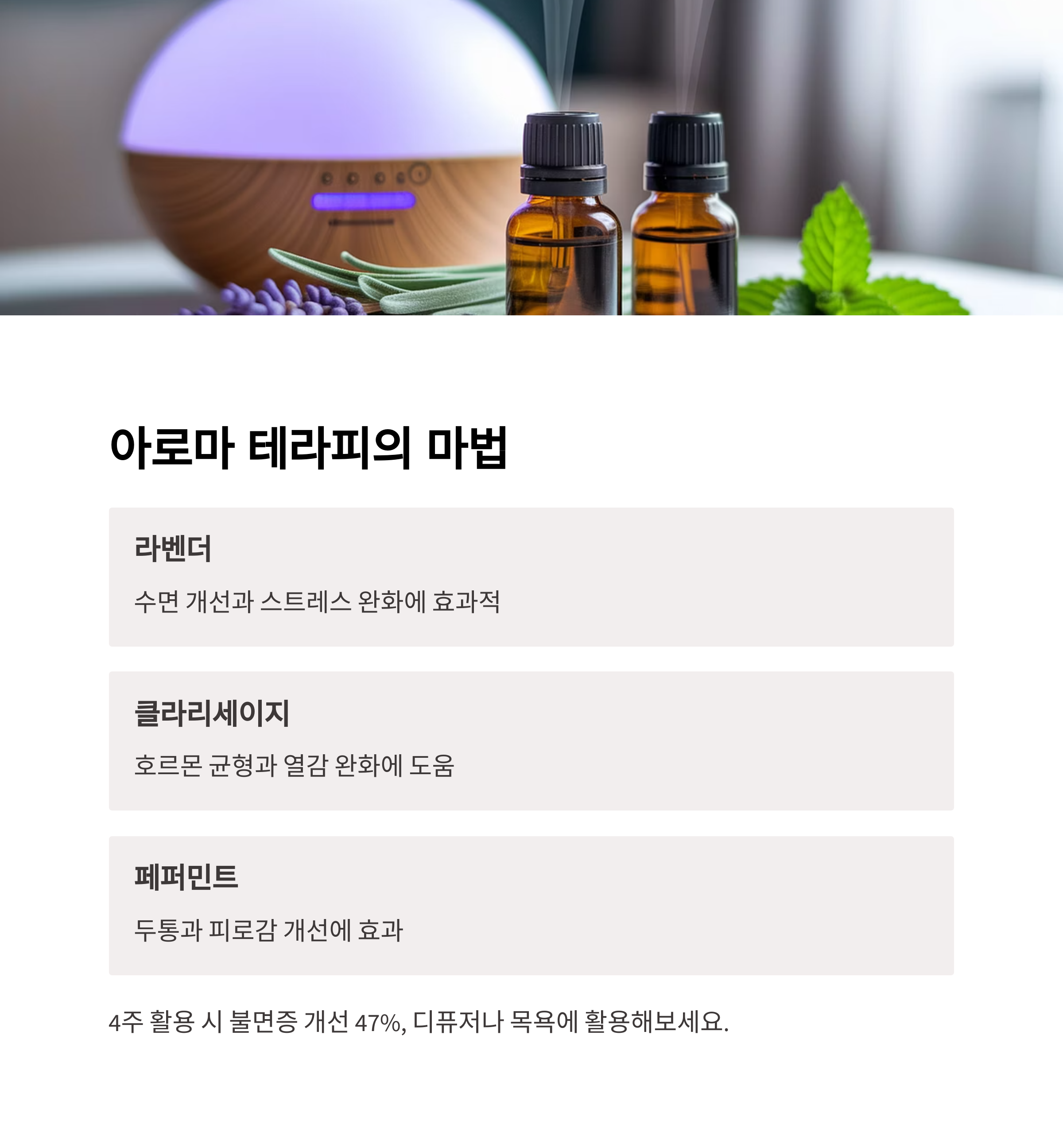 | 두부, 콩, 석류 등 여성호르몬 유사 작용 | 라벤더, 캐모마일로 불안과 불면 완화 | 심신 안정, 호흡 조절을 통한 회복 촉진 |