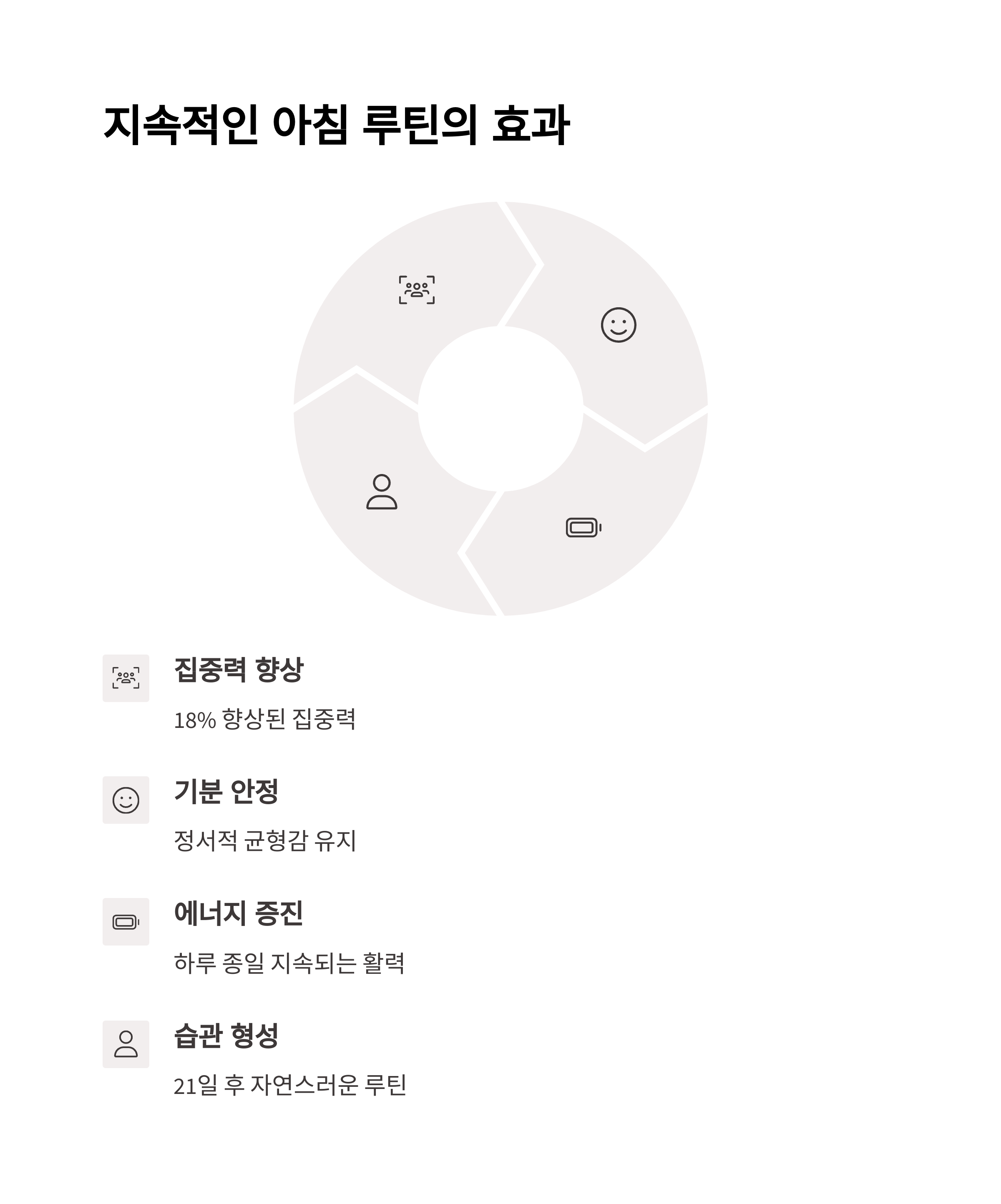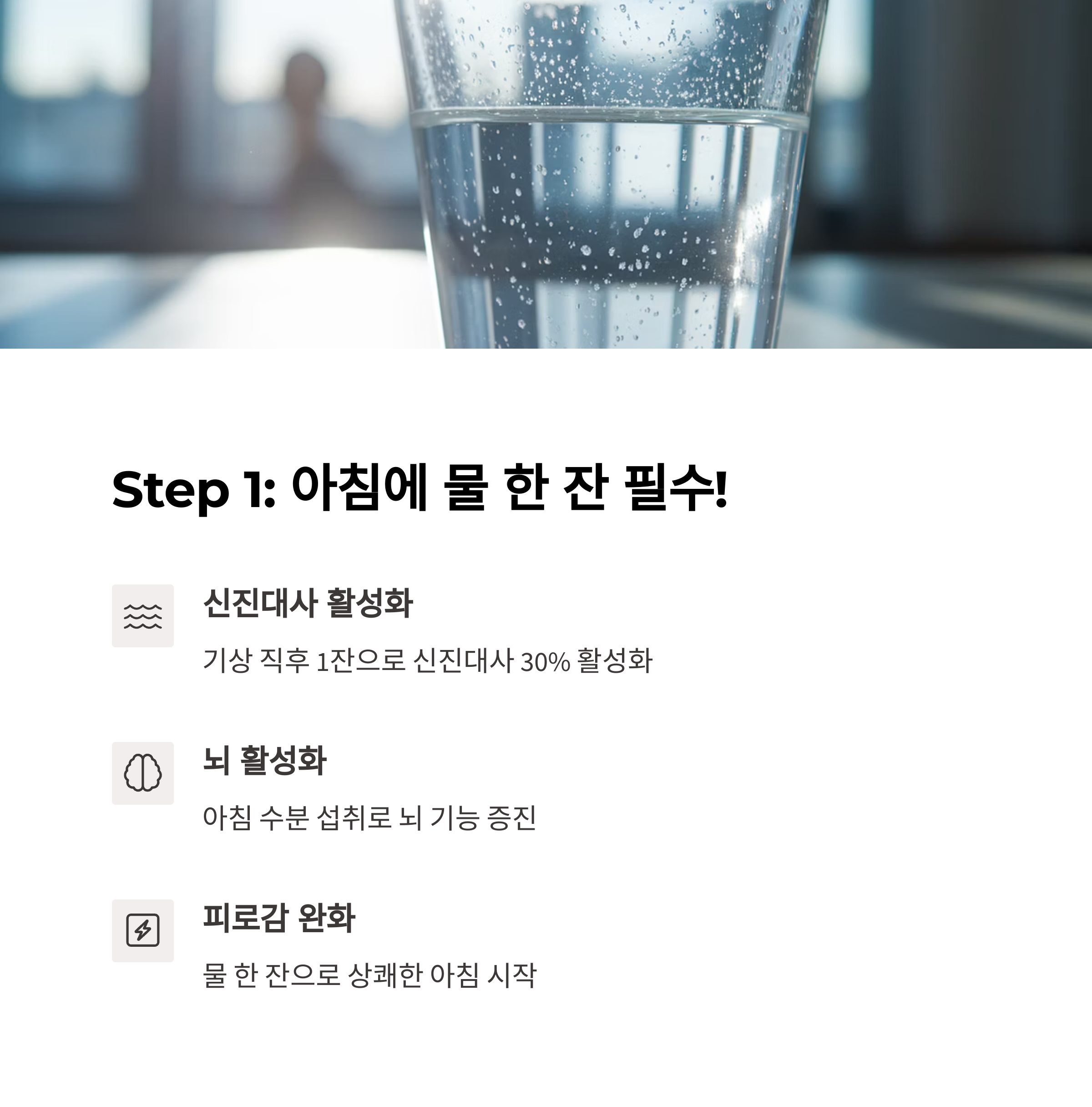 | 아침 루틴 효과 | 신진대사 활성화, 집중력 향상, 에너지 충전 등 다양한 효과를 줍니다. |