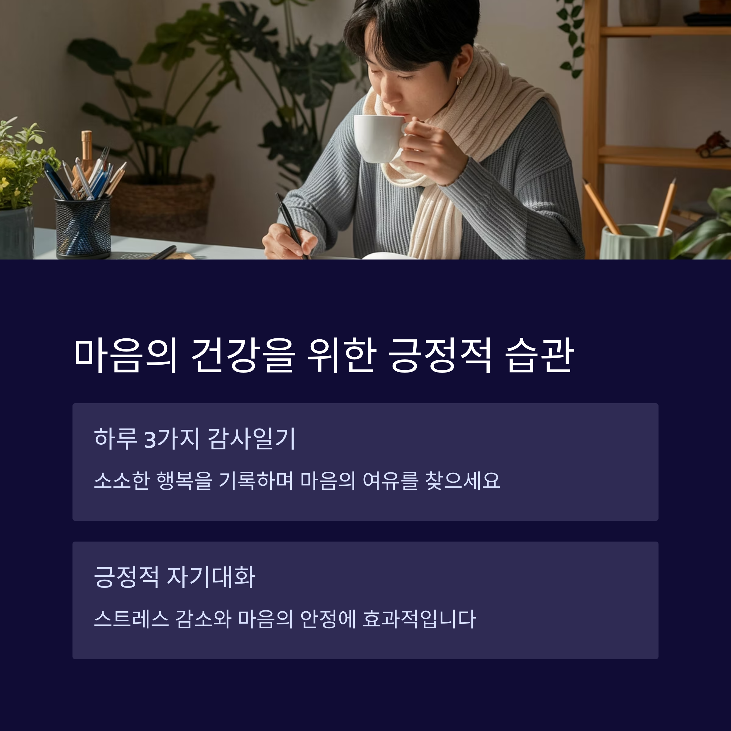 | 스트레칭, 천천히 식사, 감사 일기 | 아침 루틴에 포함, 하루 1가지 집중 | 소화 개선, 정서 안정, 자기 관리 강화 |
