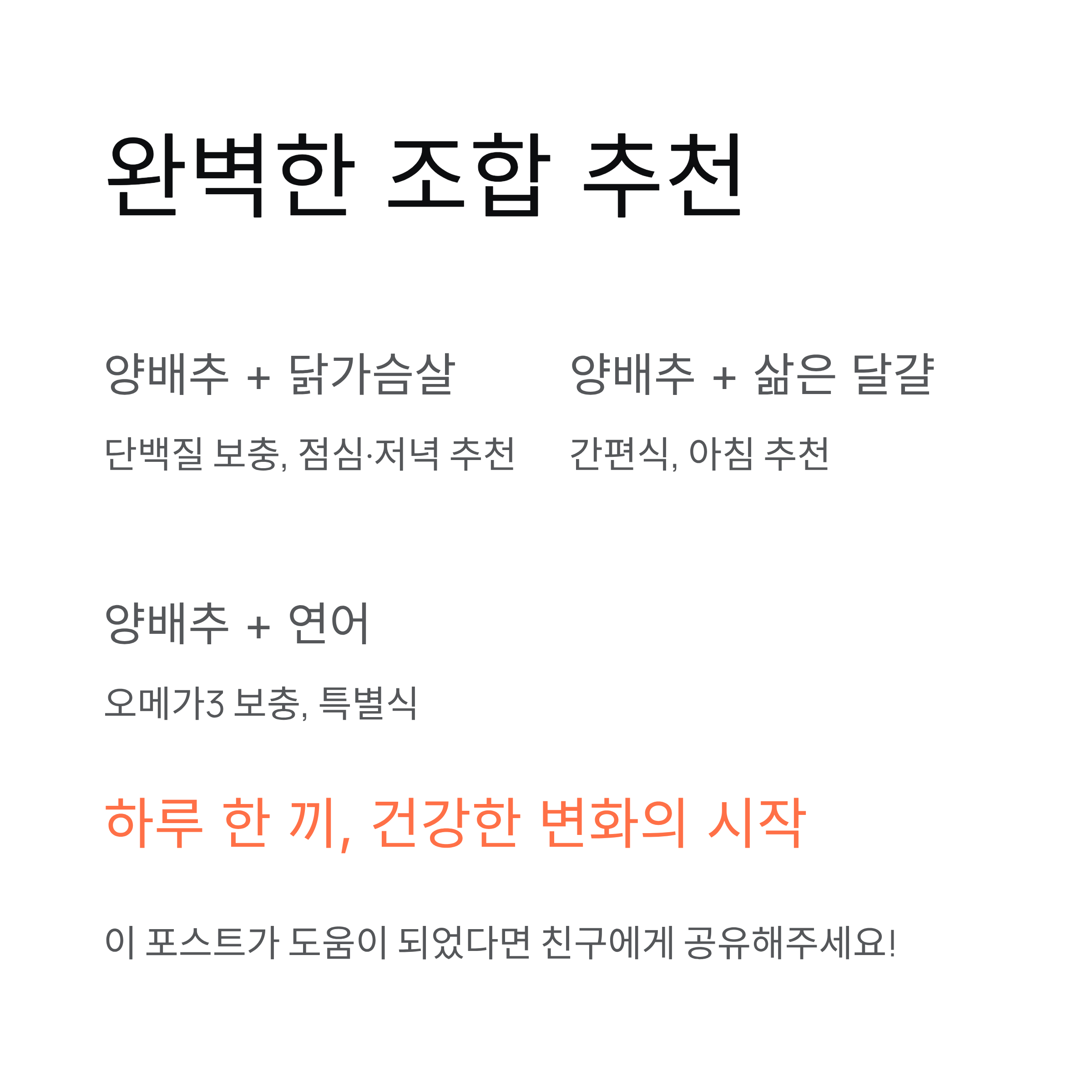 | 양배추 + 닭가슴살 | 단백질 보충 | 점심, 저녁 |