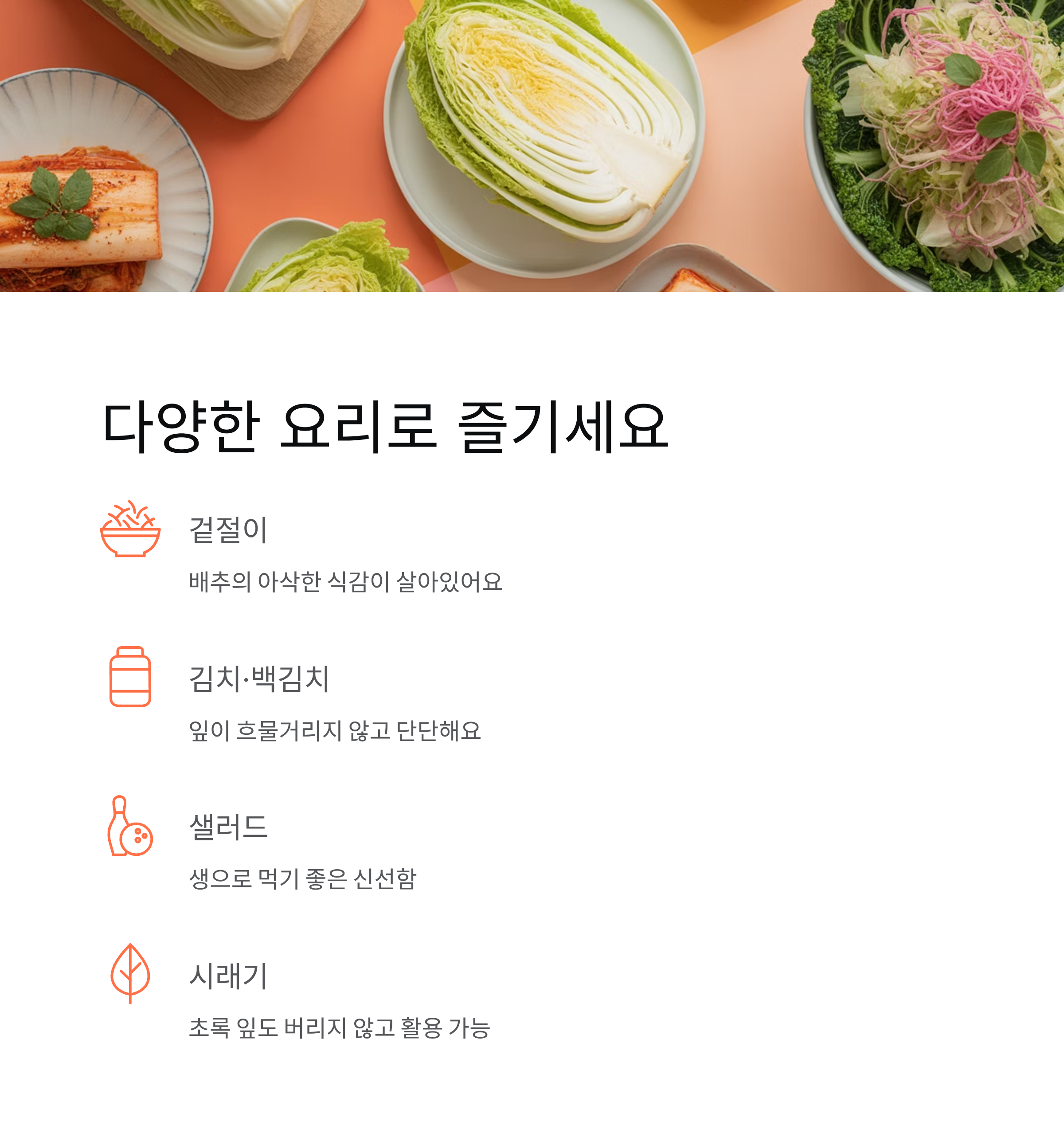미니배추는 활용 범위가 넓습니다. 겉절이로 무치면 배추의 식감이 살아 있고, 김치나 백김치로 담가도 잎이 흐물거리지 않습니다. 샐러드용으로도 잘 어울리며, 초록 잎 부분은 버리지 않고 시래기로 활용하면 식재료 낭비 없이 사용할 수 있습니다.