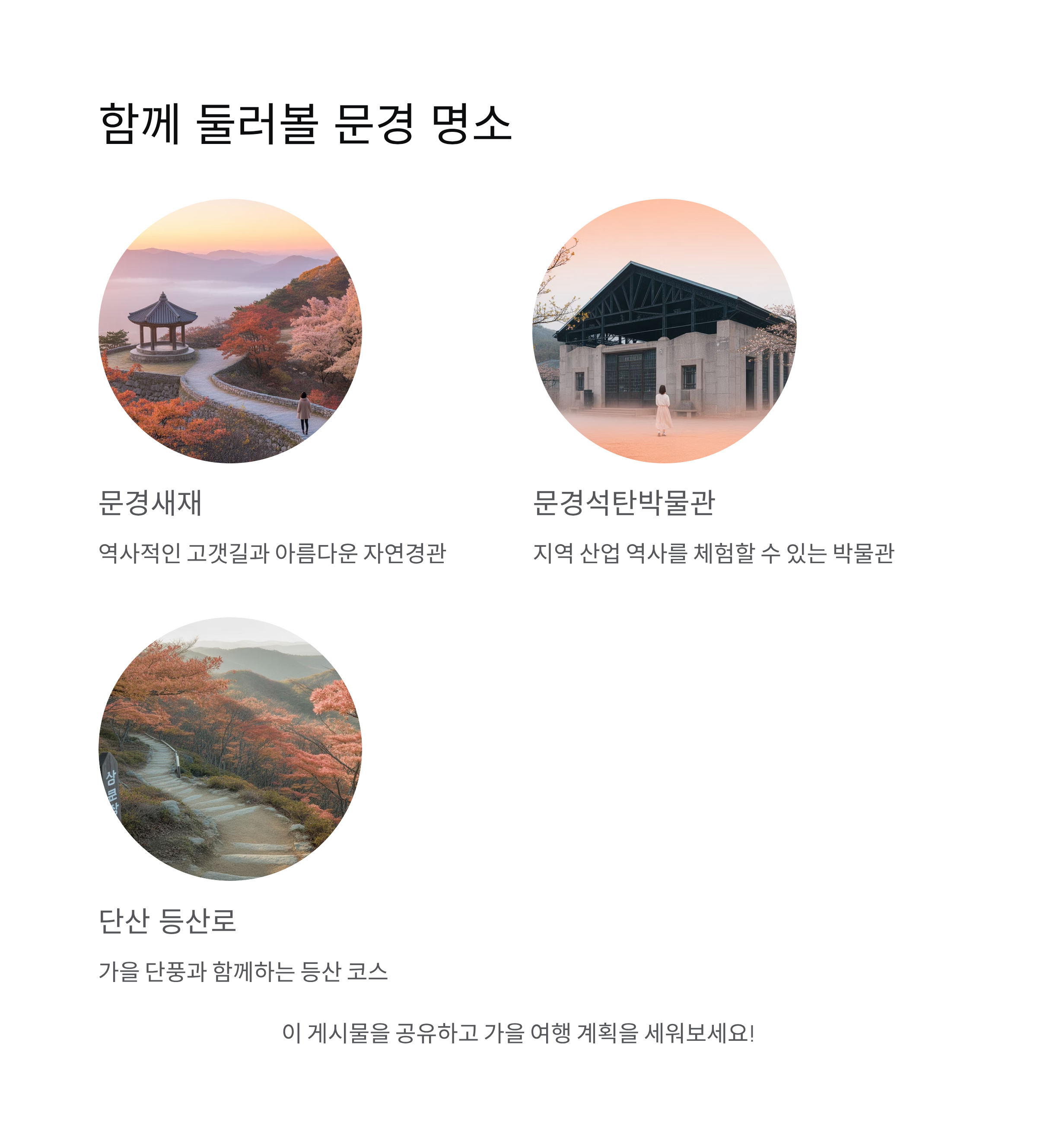 문경새재, 문경석탄박물관, 단산 등산로 등 주변 관광지도 함께 둘러보면 여행의 만족도가 훨씬 높아집니다. 오미자축제와 함께 문경의 역사와 자연을 동시에 체험해 보세요.