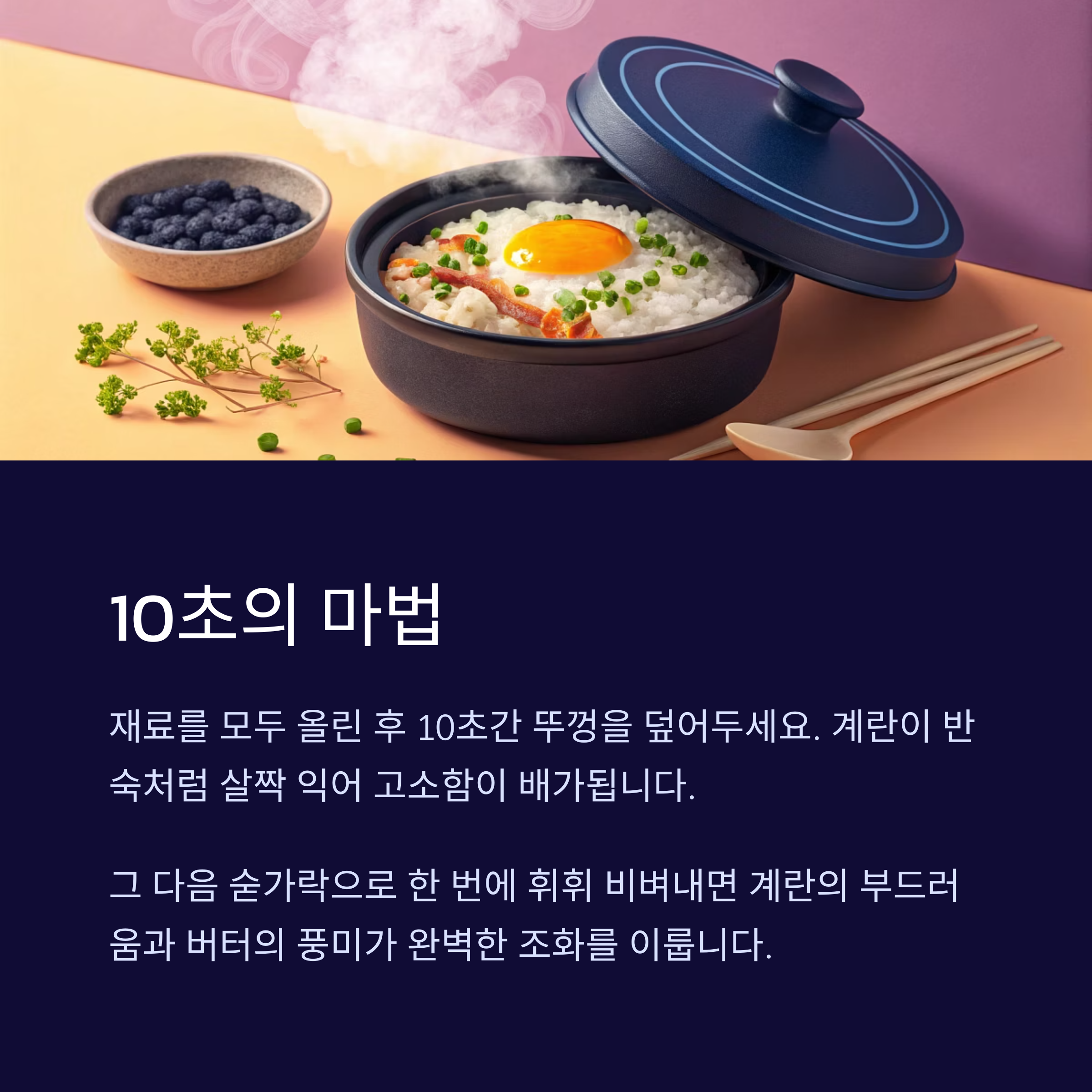 뜨거운 밥 위에 버터 → 계란 → 간장 순서로 올린 뒤 10초간 뚜껑을 덮습니다.