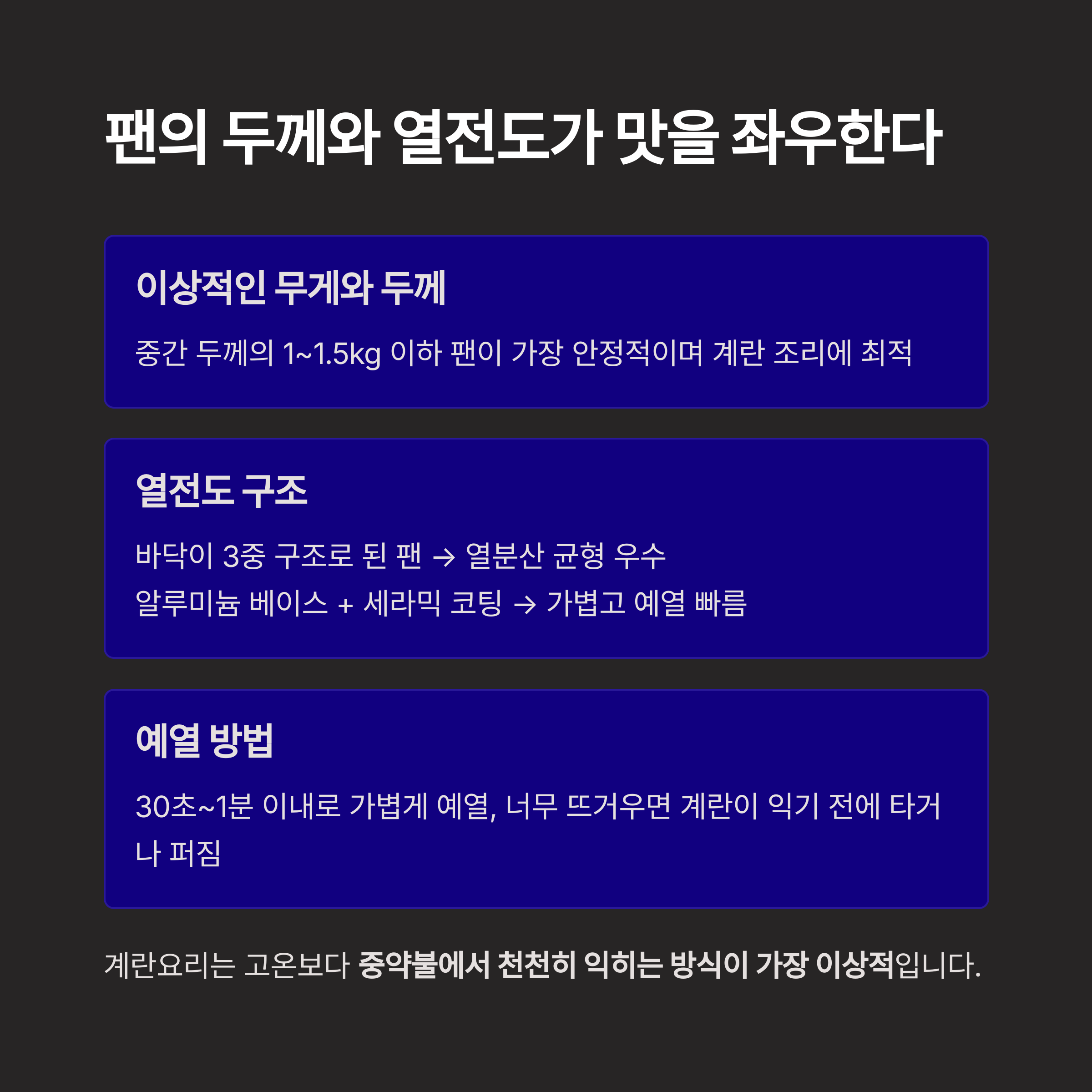 - 중간 두께의 1~1.5kg 이하 팬이 가장 안정적이며 계란 조리에 최적입니다