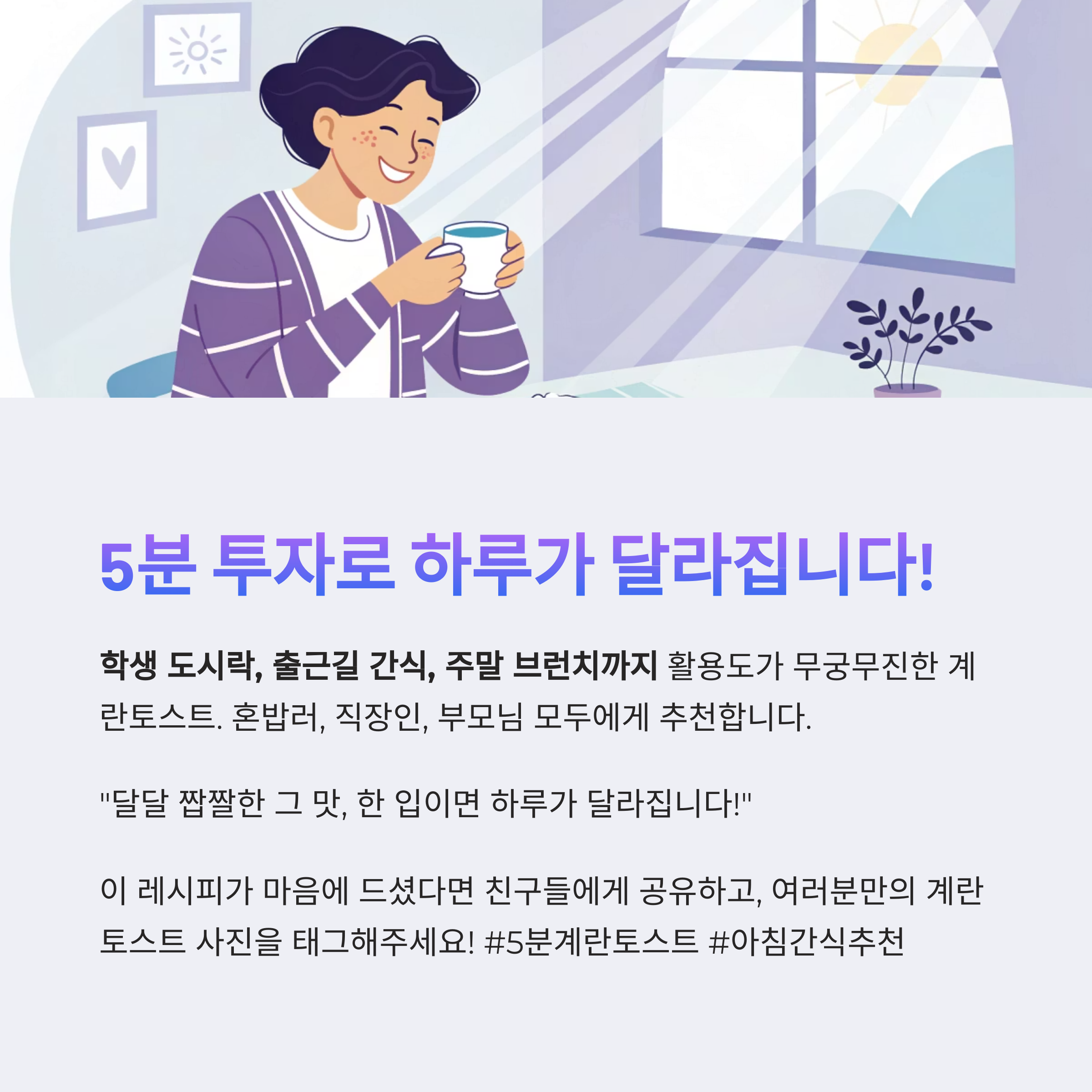 이 글에서는 불 앞에 5분만 서면 누구나 만들 수 있는 초간단 계란토스트 레시피를 소개합니다.
