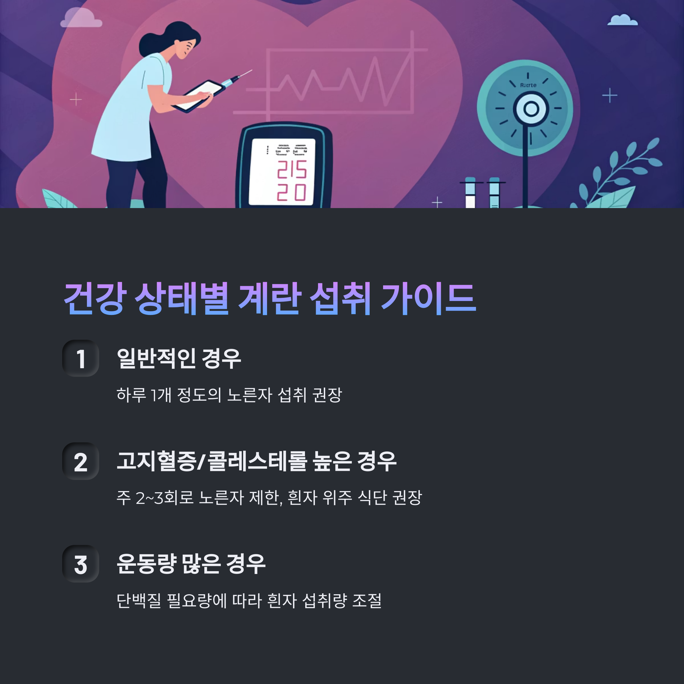 하루 1개 정도의 노른자는 영양 보완에 도움이 되며, 완전히 배제할 필요는 없습니다.