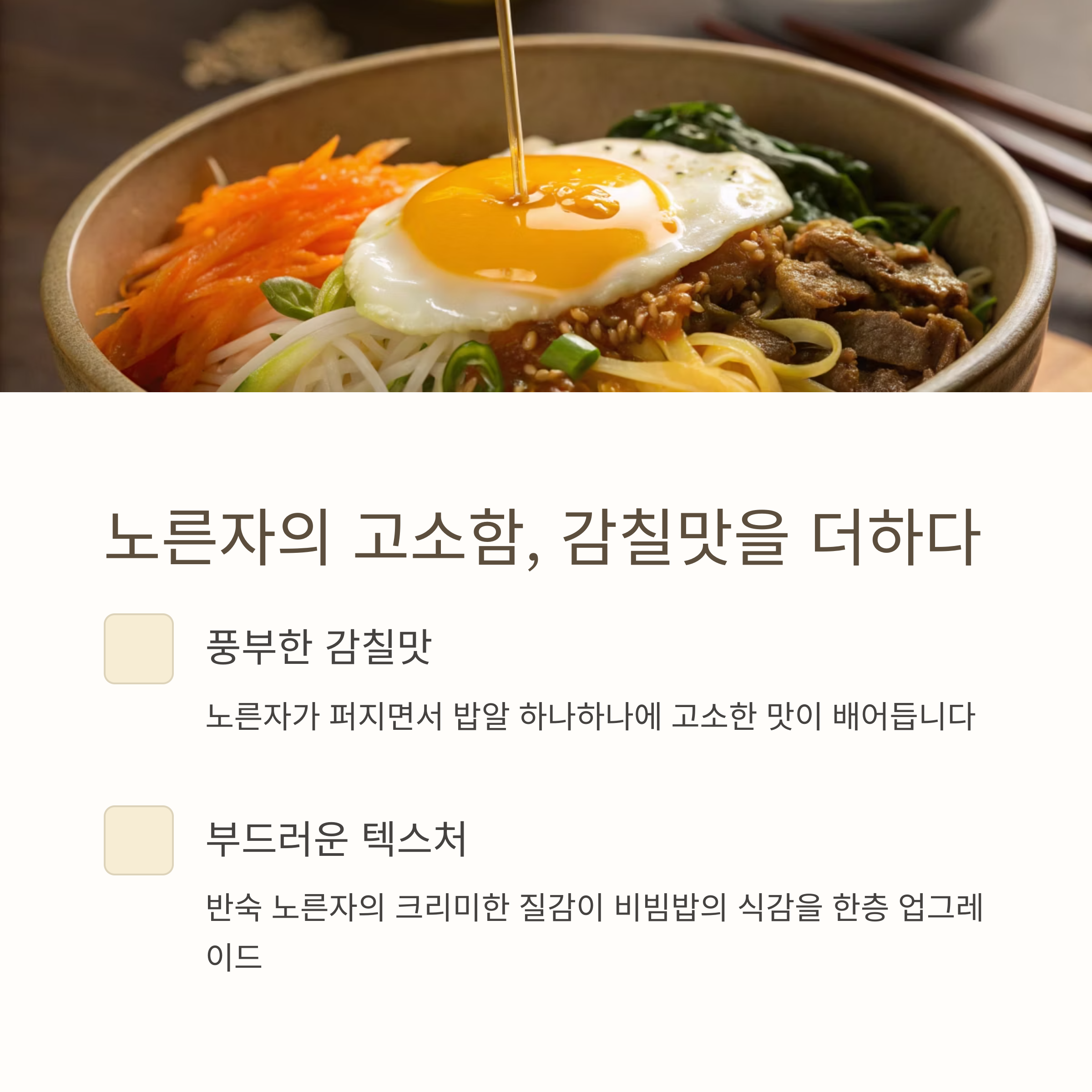 - 숟가락으로 자르면 노른자가 비빔밥 전체에 자연스럽게 섞입니다