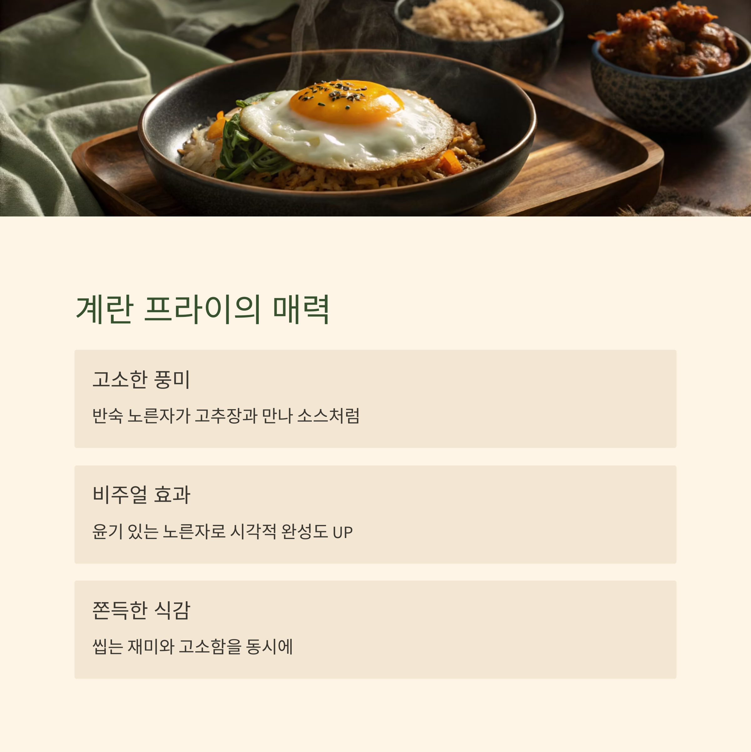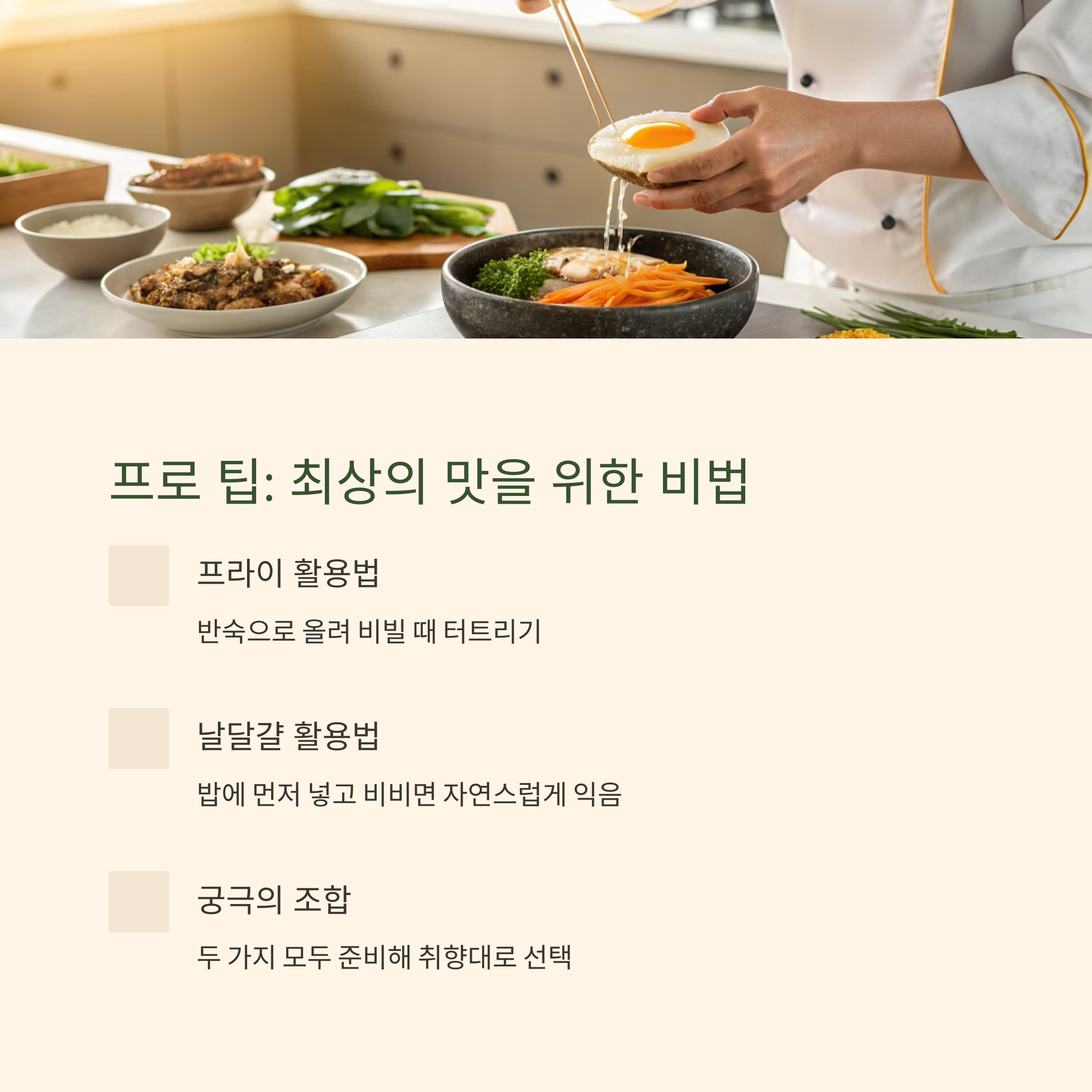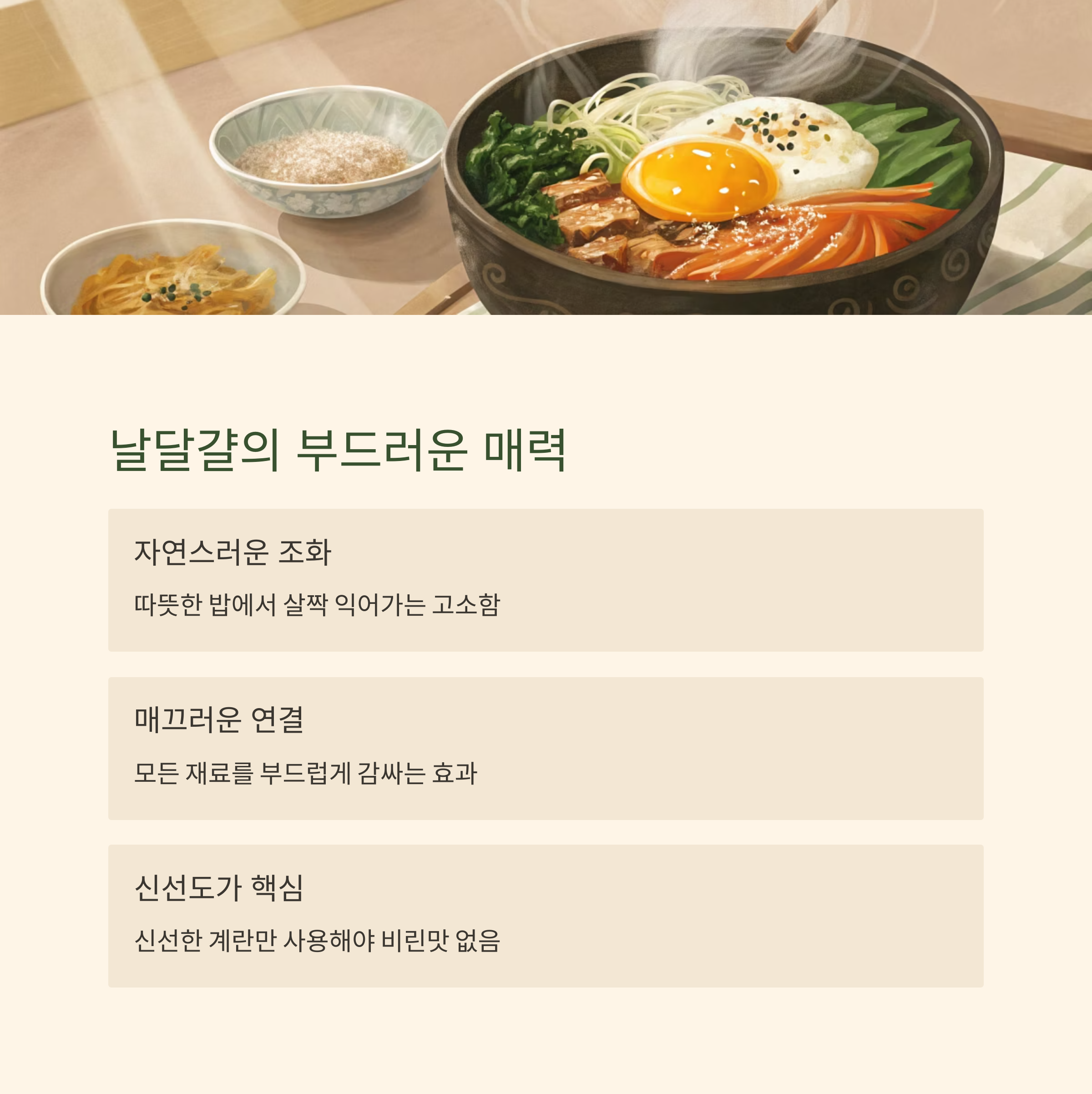 | 간장 비빔밥 | 날달걀 or 완숙 | 간장과 부드럽게 어울림 |