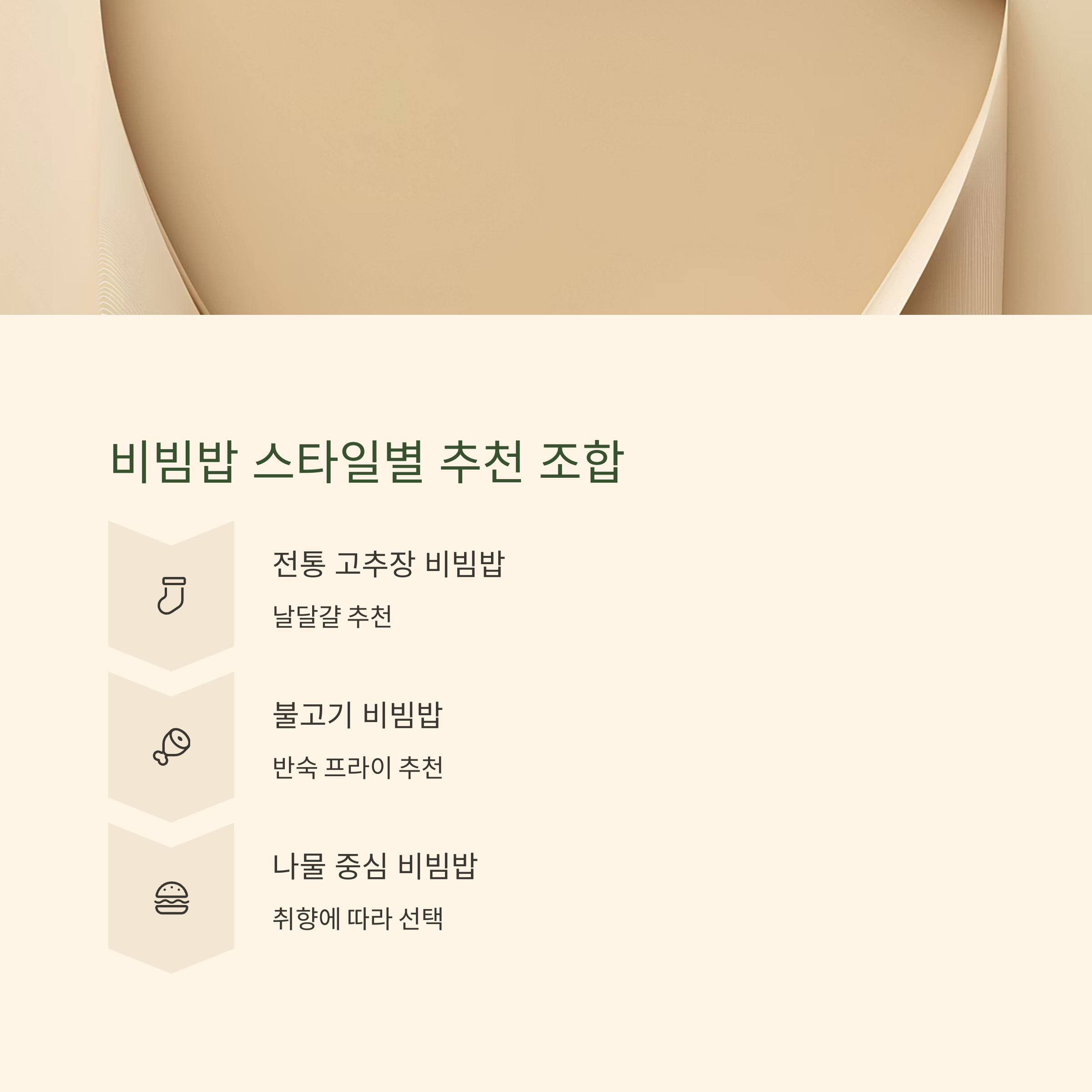 | 불고기 비빔밥 | 반숙 프라이 | 고기 풍미 강조 |