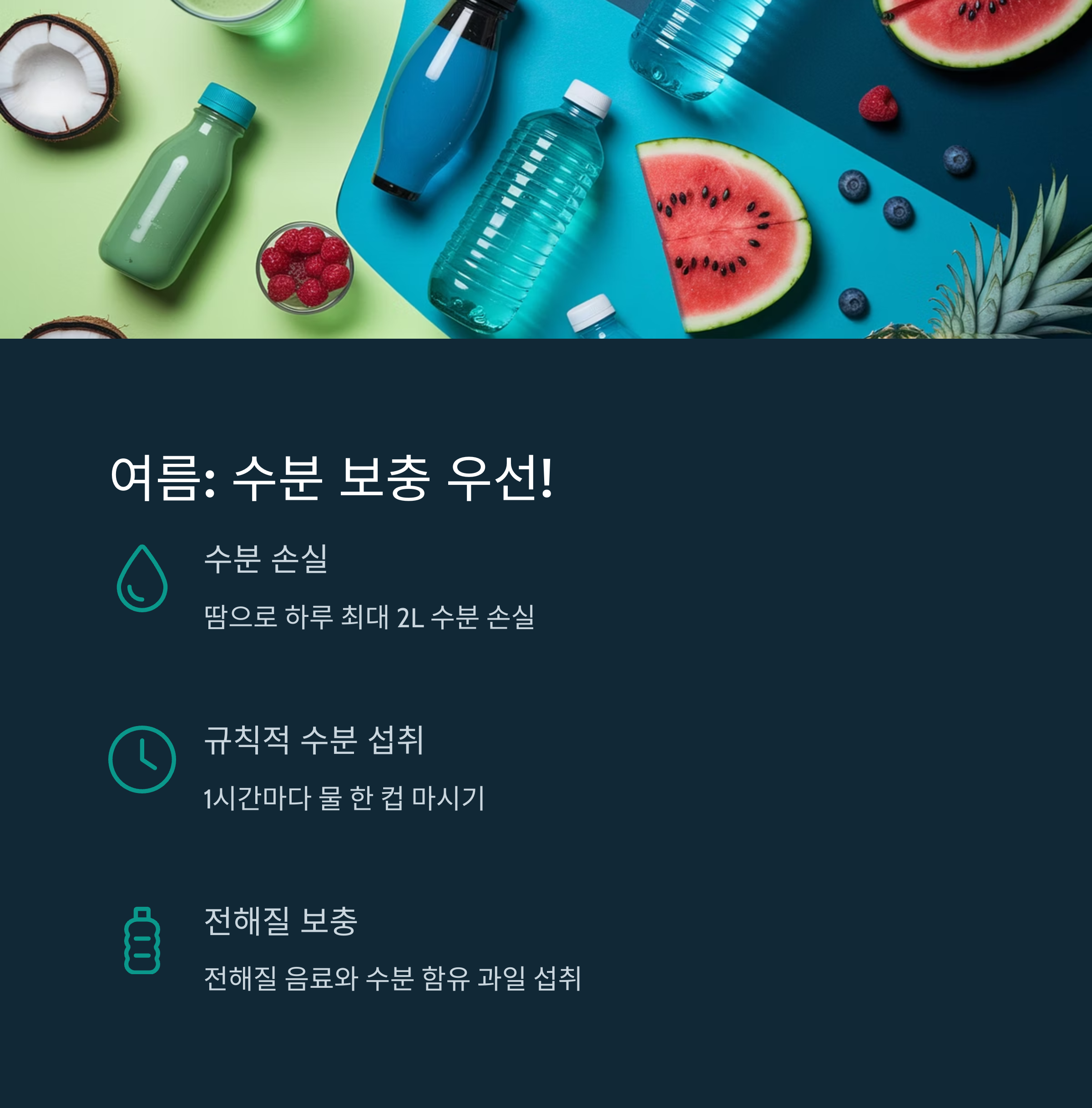 봄: 면역 저하, 미세먼지 여름: 탈수와 냉방병 | 비타민 섭취, 제철 과일, 얇은 겉옷 챙기기 | 면역력 강화, 피로 회복, 수분 보충 |