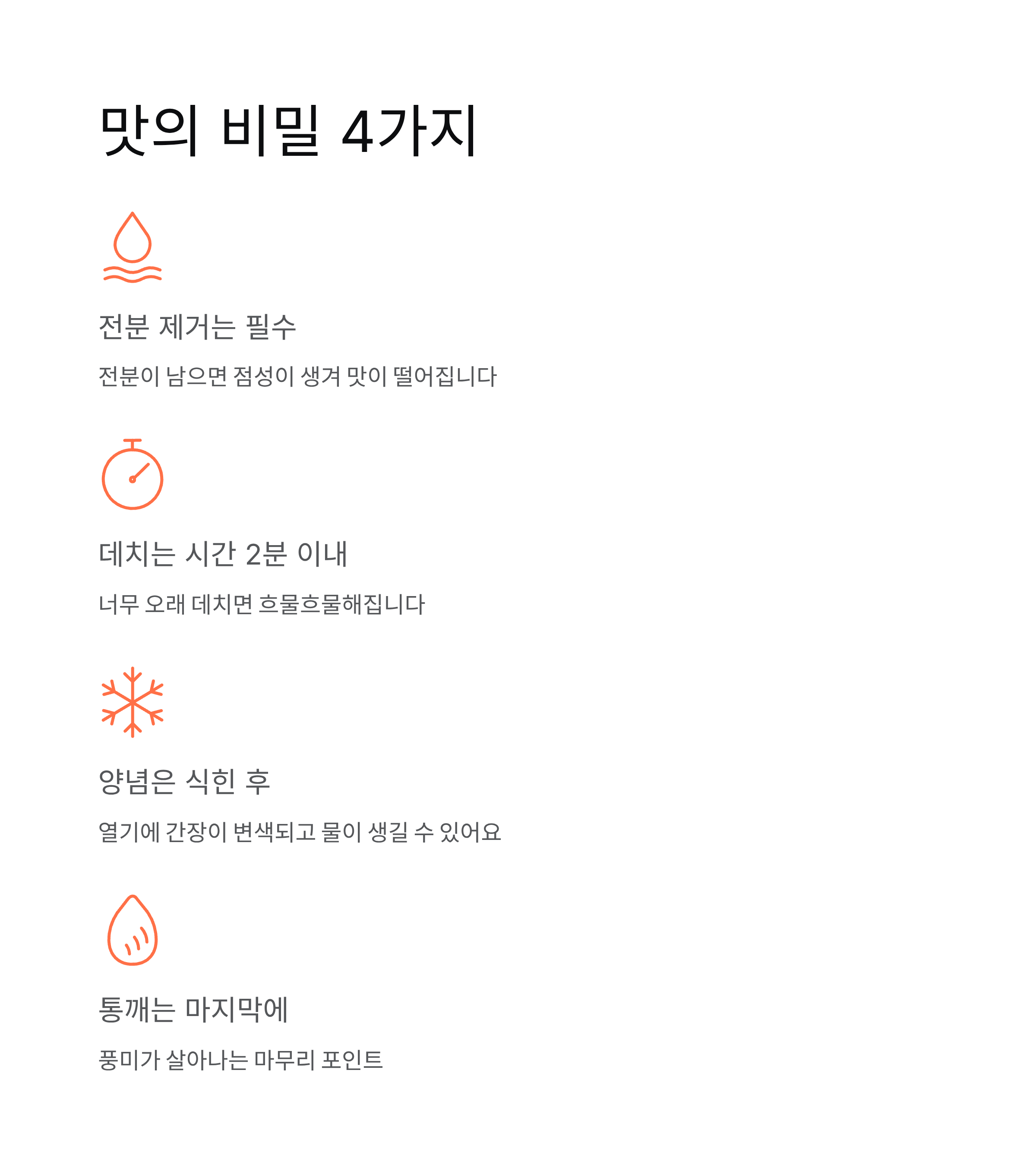 - 전분 제거는 필수 – 전분이 남으면 점성이 생겨 맛이 떨어집니다.