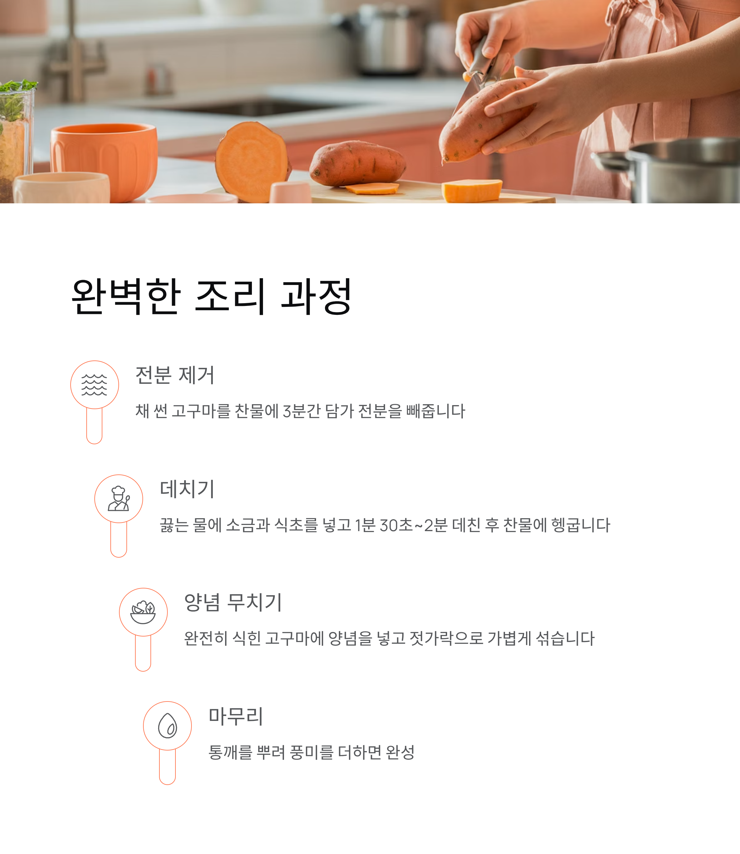 | 고구마를 생으로 무쳐도 되나요? | 가능하지만, 전분기가 많아 질척할 수 있으므로 살짝 데치는 게 좋아요. |