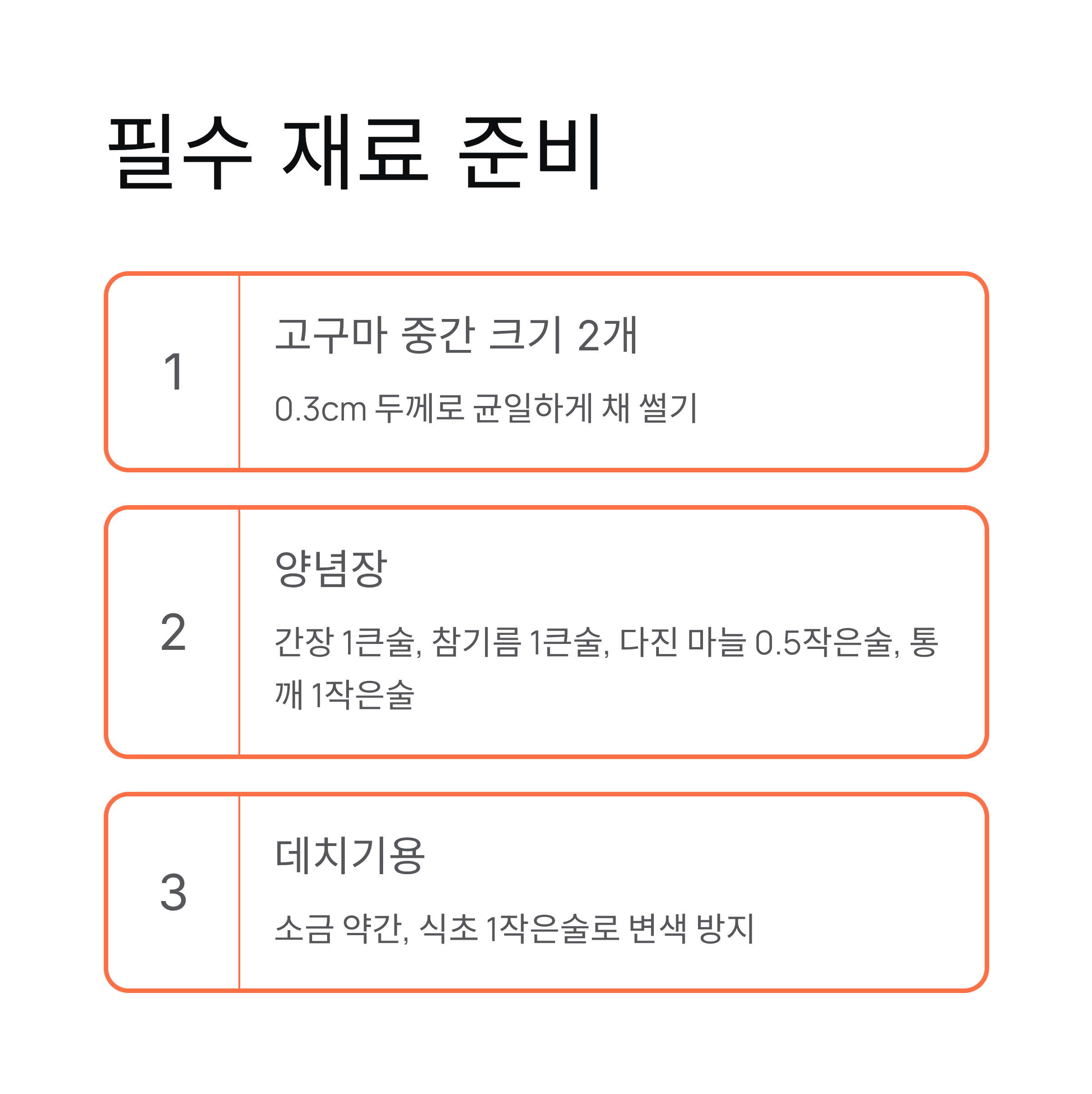 | 고구마 | 중간 크기 2개 | 껍질 벗겨 채 썰기 |