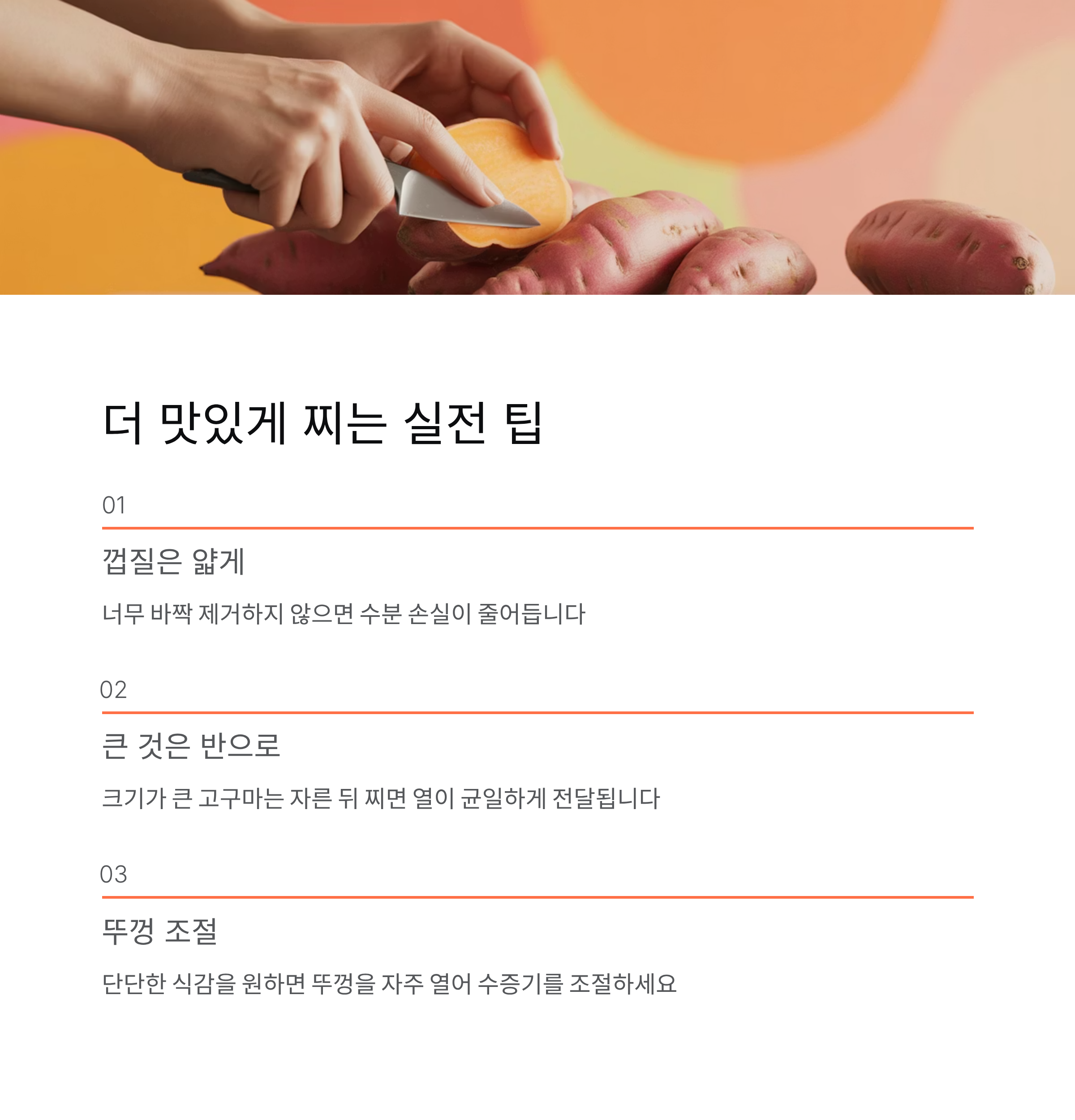 고구마를 씻을 때 껍질을 너무 바짝 제거하지 않으면 조리 중 수분 손실이 줄어들어 더 촉촉한 결과를 얻을 수 있습니다. 또한 크기가 큰 고구마는 반으로 자른 뒤 찌면 속까지 열이 더 균일하게 전달되어 전체 식감이 일정해집니다. 작은 차이지만 완성도의 깊이가 달라지는 순간입니다.