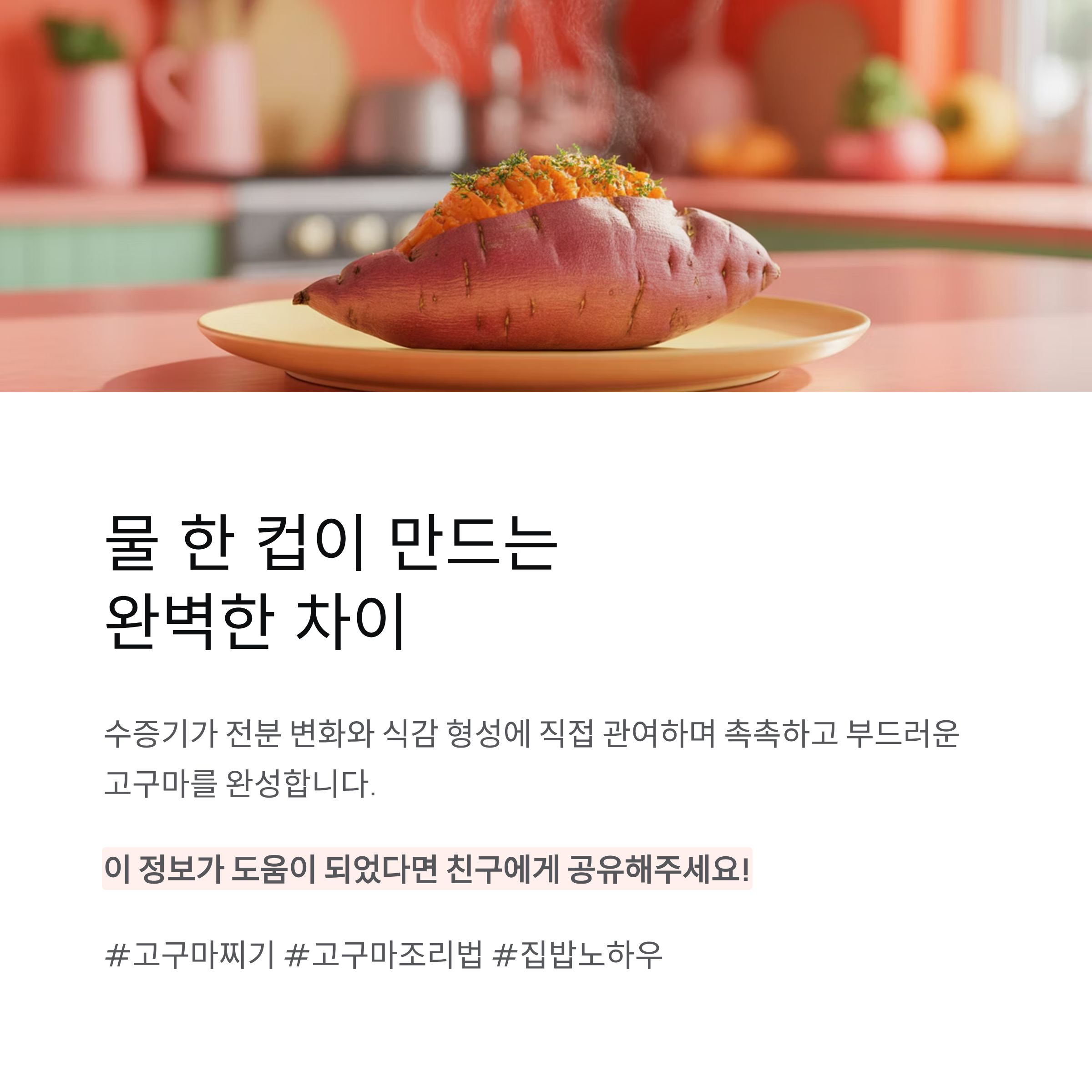 고구마를 찔 때 물을 반드시 넣어야 하는 이유는 단순 편의가 아니라 과학적 원리가 있습니다. 수증기가 전분 변화와 식감 형성에 직접 관여하며 촉촉하고 부드러운 고구마를 완성해 주기 때문입니다. 물 한 컵이 만들어내는 조리 환경의 차이를 이해하면 어떤 고구마를 사용하든 실패 없이 맛있는 결과를 얻을 수 있습니다.