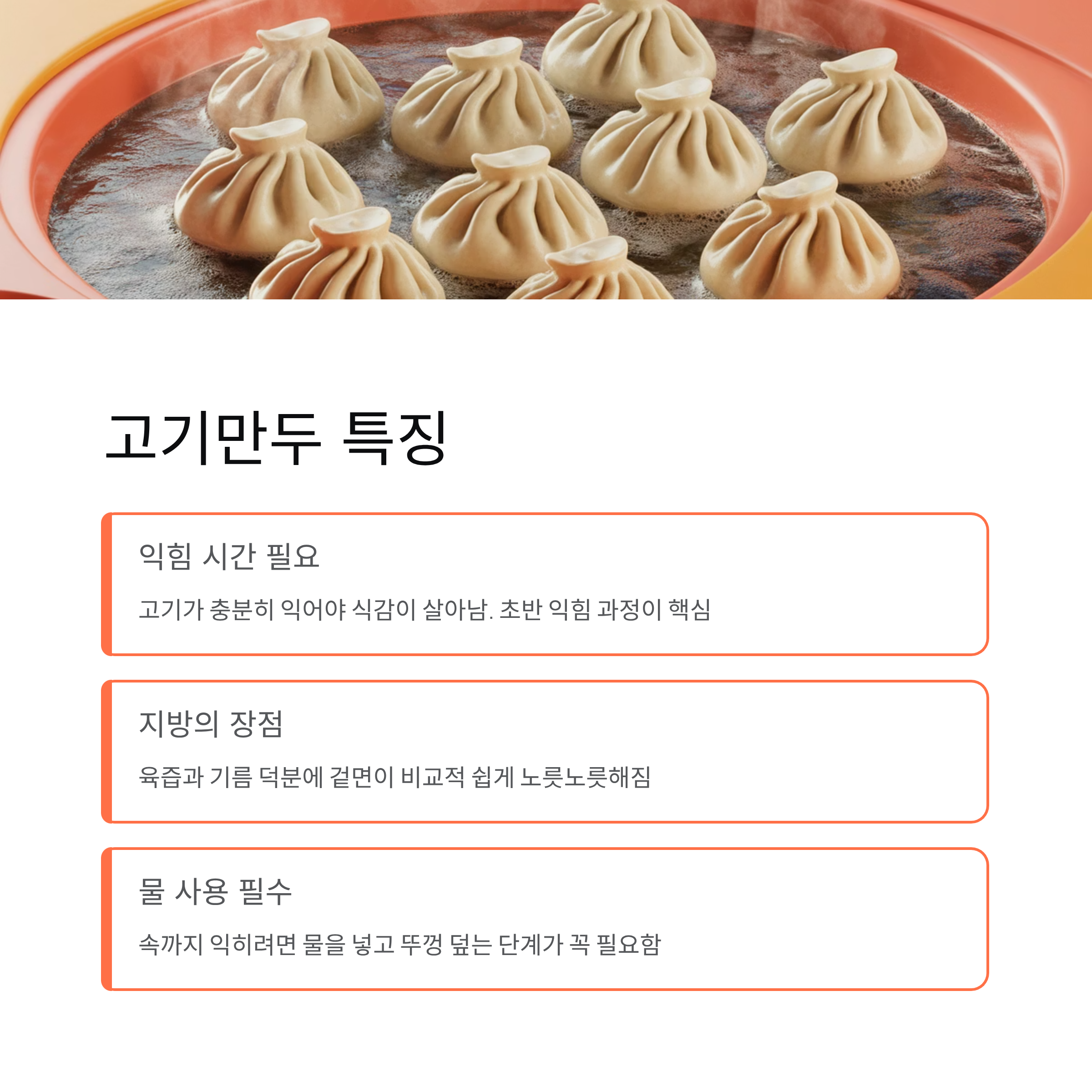 고기만두는 속이 익는 데 시간이 조금 더 필요합니다. 고기가 충분히 익지 않으면 식감이 떨어지기 때문에 초반 익힘 과정이 중요합니다. 대신 고기에서 나오는 지방 덕분에 겉면이 비교적 쉽게 노릇해지는 장점이 있습니다. 물을 활용한 익힘 단계가 꼭 필요한 이유도 여기에 있습니다.