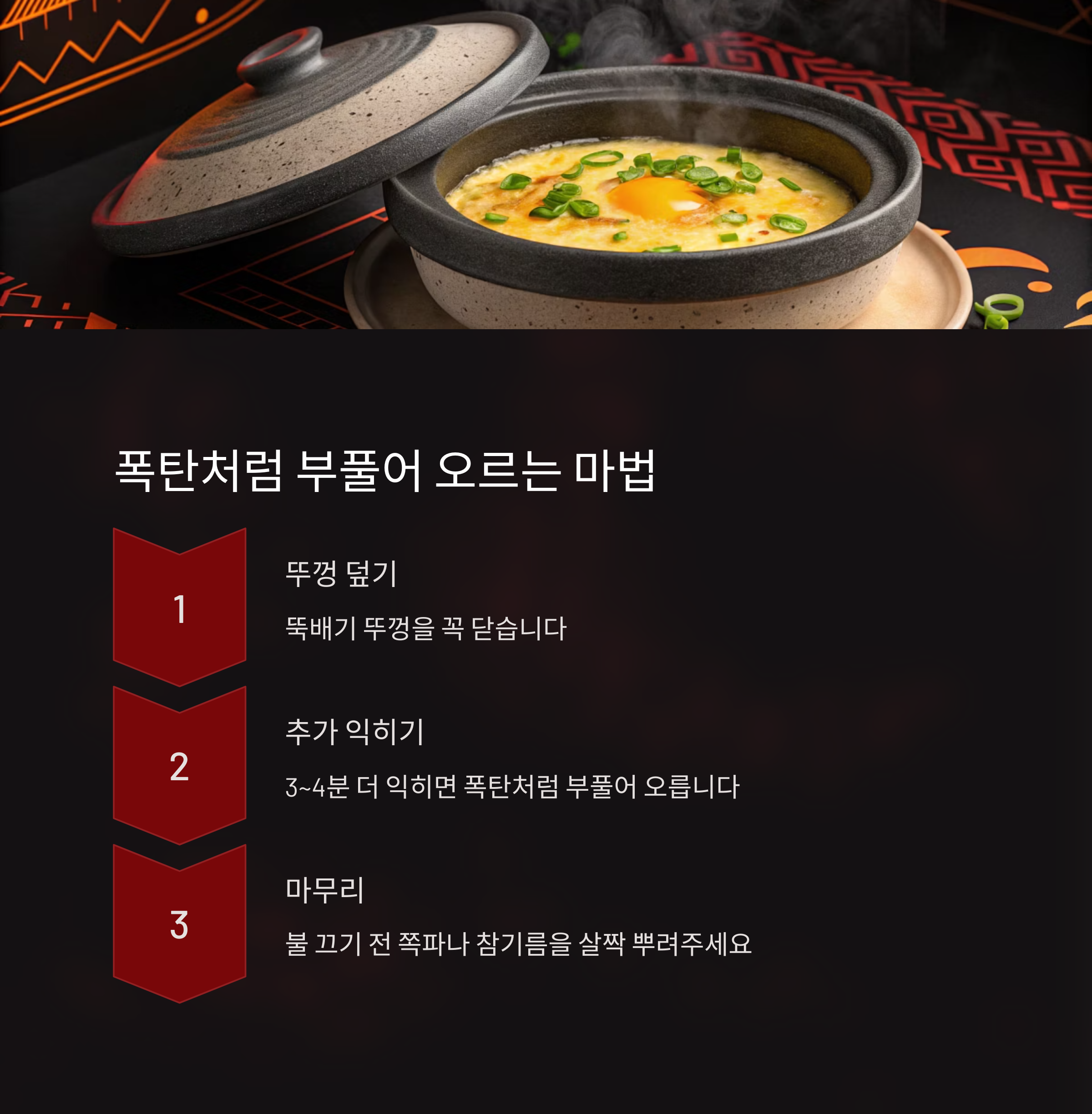 뚝배기 조리에 맞춘 계란과 육수 비율이 핵심입니다.