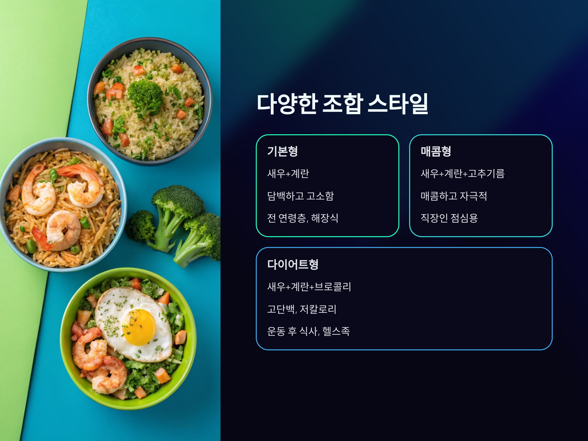 | 새우+계란+브로콜리 | 고단백, 다이어트용 | 운동 후 식사, 헬스족 |
