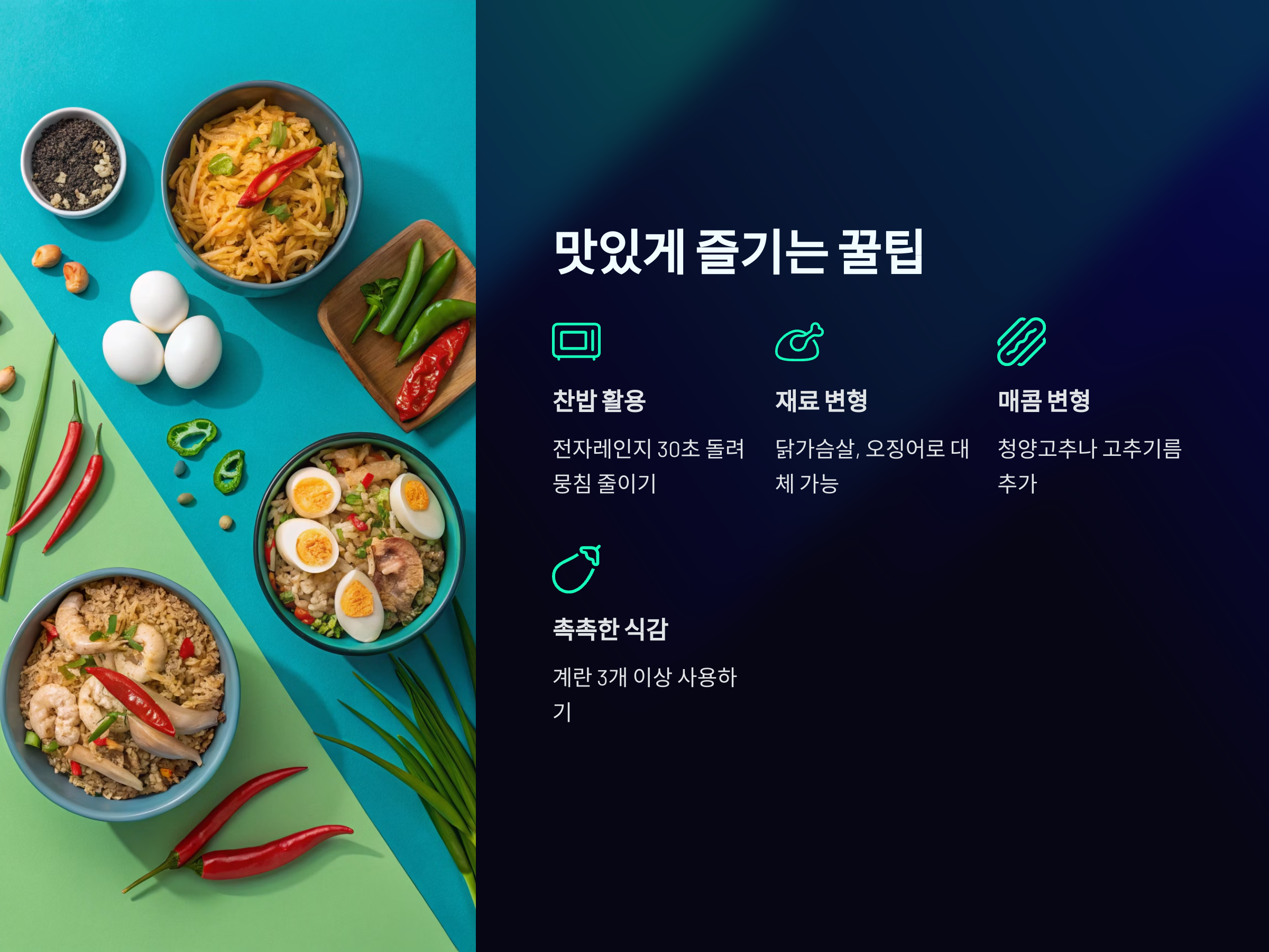 간단한 재료와 짧은 조리 시간에도 풍부한 영양과 깊은 맛을 동시에 담을 수 있어 집밥, 도시락, 브런치까지 모두 활용 가능한 범용 레시피입니다.