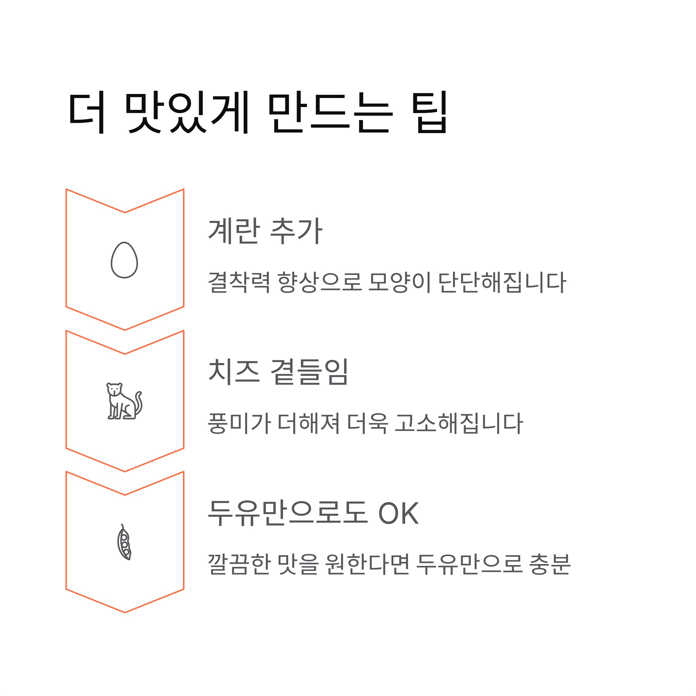 두부 반죽에 두유를 살짝 넣어주면 수분감이 유지되어 촉촉하고 부드럽게 완성됩니다.