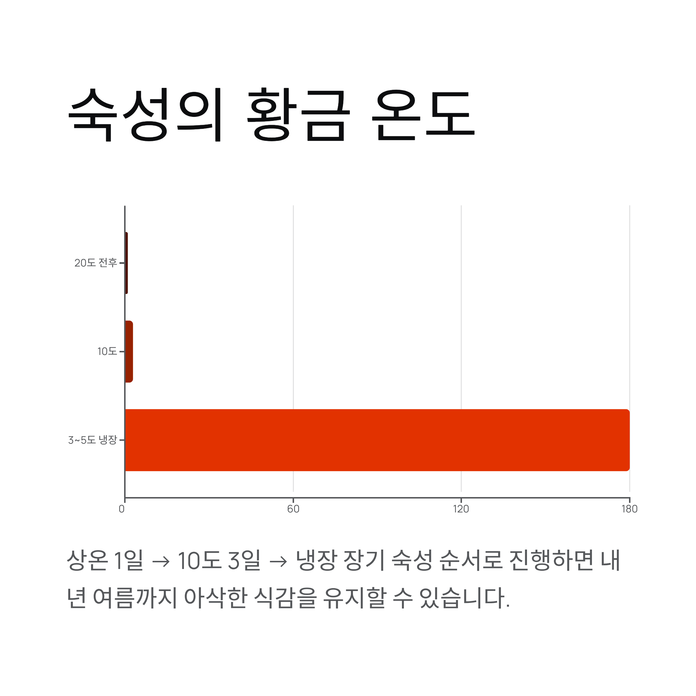 3~5도 (냉장보관) | 장기 숙성 | 아삭한 식감 유지, 감칠맛 완성 |