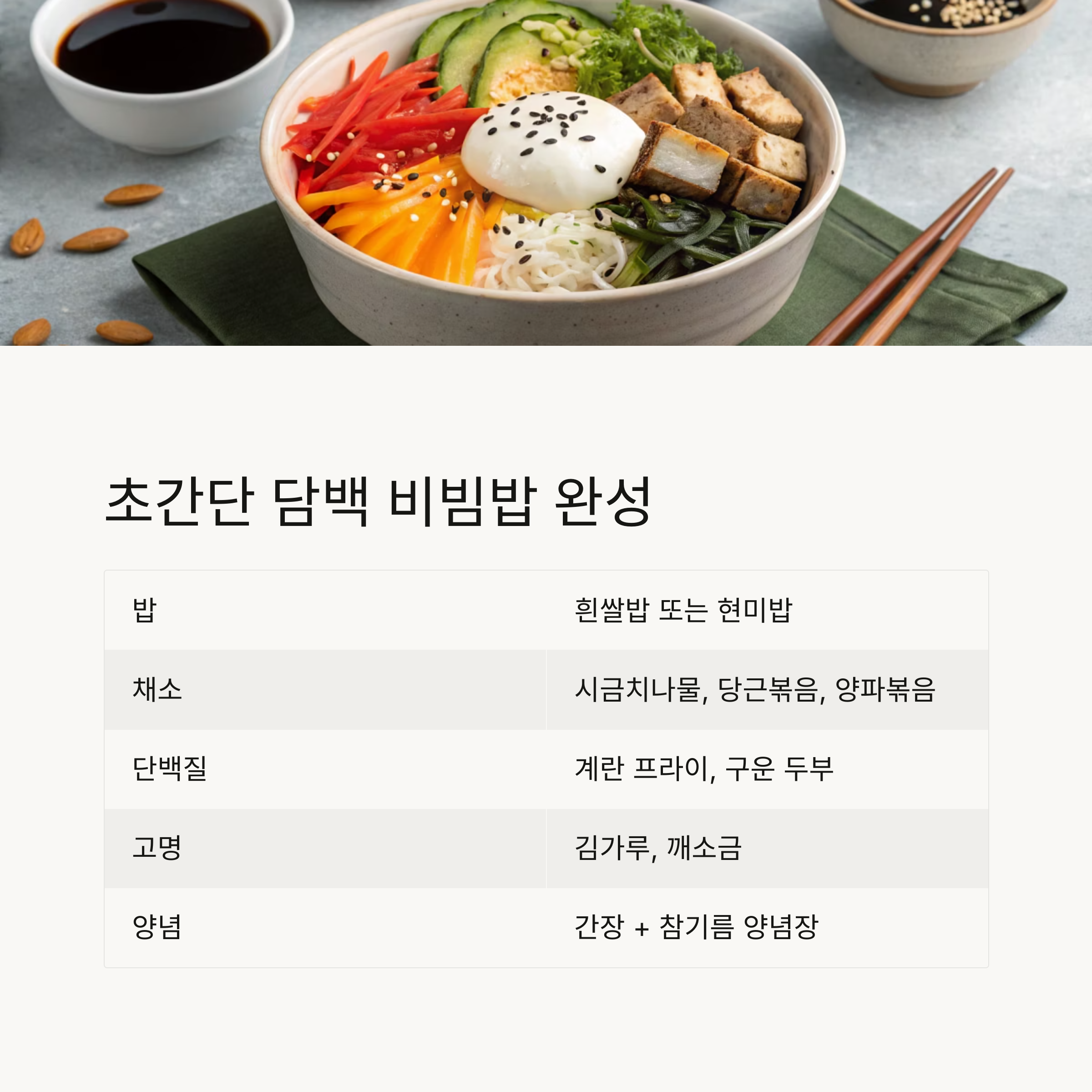 기본 조합 예시: 초간단 담백 비빔밥 구성