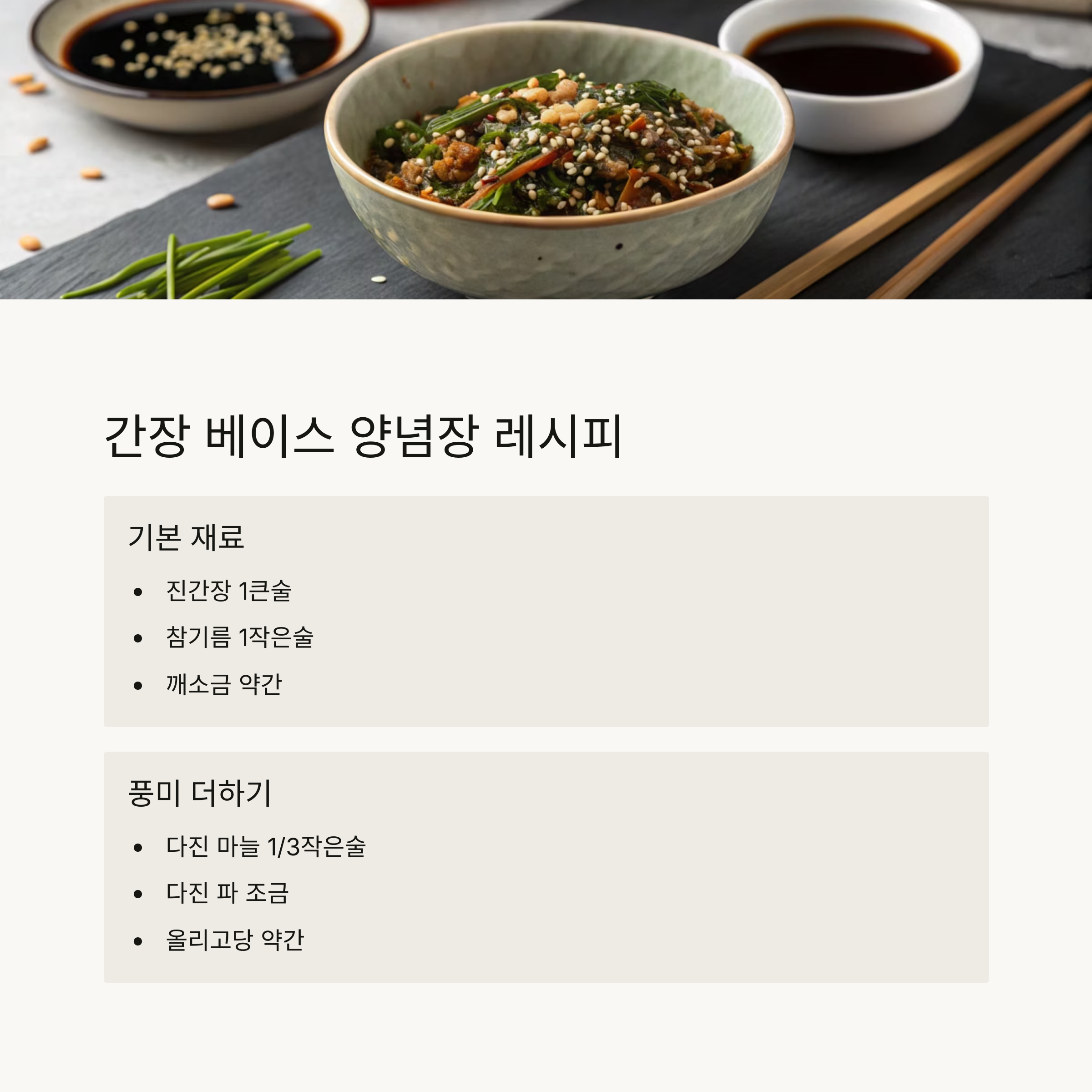 | 양념 | 간장 + 참기름 양념장 |