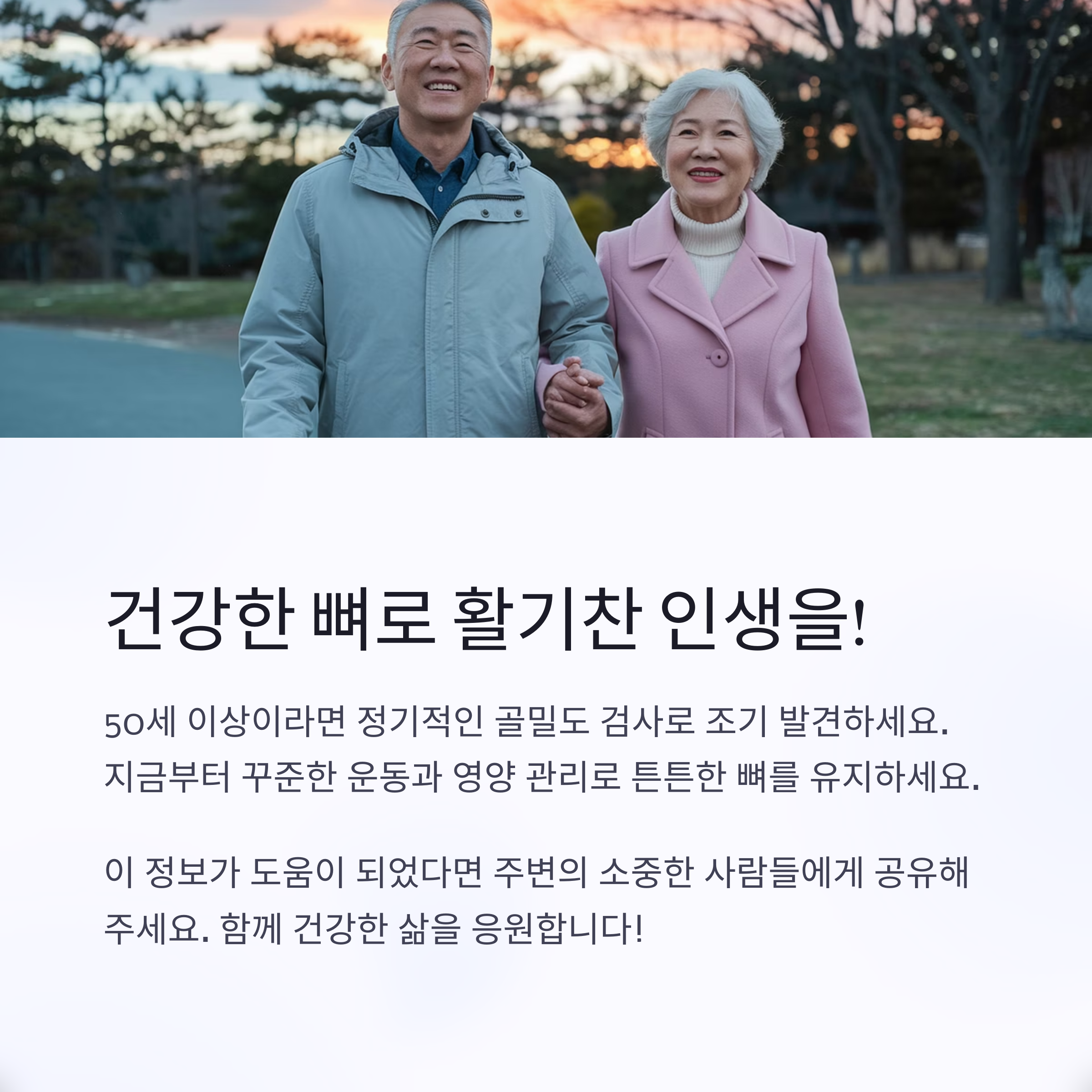 골다공증은 시간이 지날수록 증상이 심해질 수 있는 질환이기 때문에 조기 예방이 무엇보다 중요합니다. 지금 당장은 뼈의 상태를 느끼기 어려울 수 있지만, 작은 실천 하나가 미래의 건강을 좌우합니다. 올바른 식습관, 규칙적인 운동, 적절한 햇빛 노출 등은 누구나 실천 가능한 간단한 방법입니다. 우리 모두 일상 속에서 뼈 건강을 위한 노력을 꾸준히 실천해 나간다면 골다공증으로 인한 고통과 불편함을 미리 막을 수 있습니다. 오늘부터라도 건강한 습관을 실천하며 튼튼한 뼈를 위한 삶을 시작해 보세요.