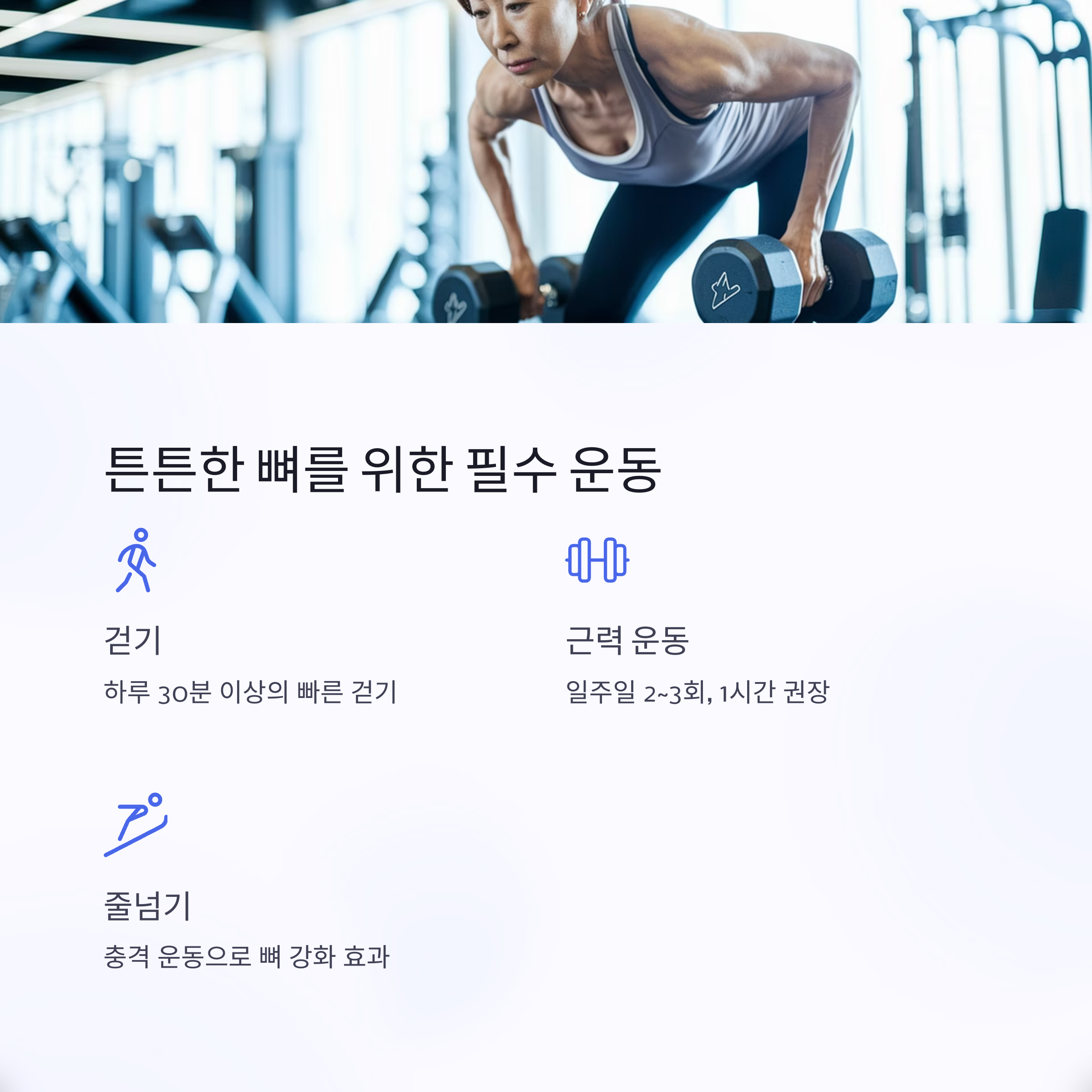 | 뼈 자극을 위한 체중부하 운동 중심 구성 | 가공식품 줄이고 나트륨 섭취 제한 | 실내 활동 시 비타민D 보충제 병행 고려 |