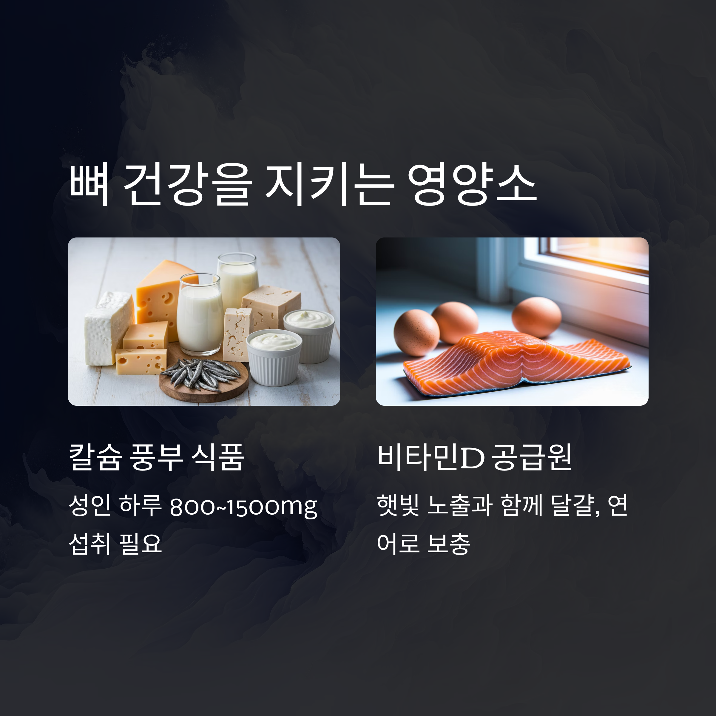 | 걷기, 근력 운동 등 주 3회 이상 실천하기 | 칼슘, 비타민D가 풍부한 식재료 섭취 | 하루 15분 이상 햇볕 쬐기, 오전 시간대 권장 |