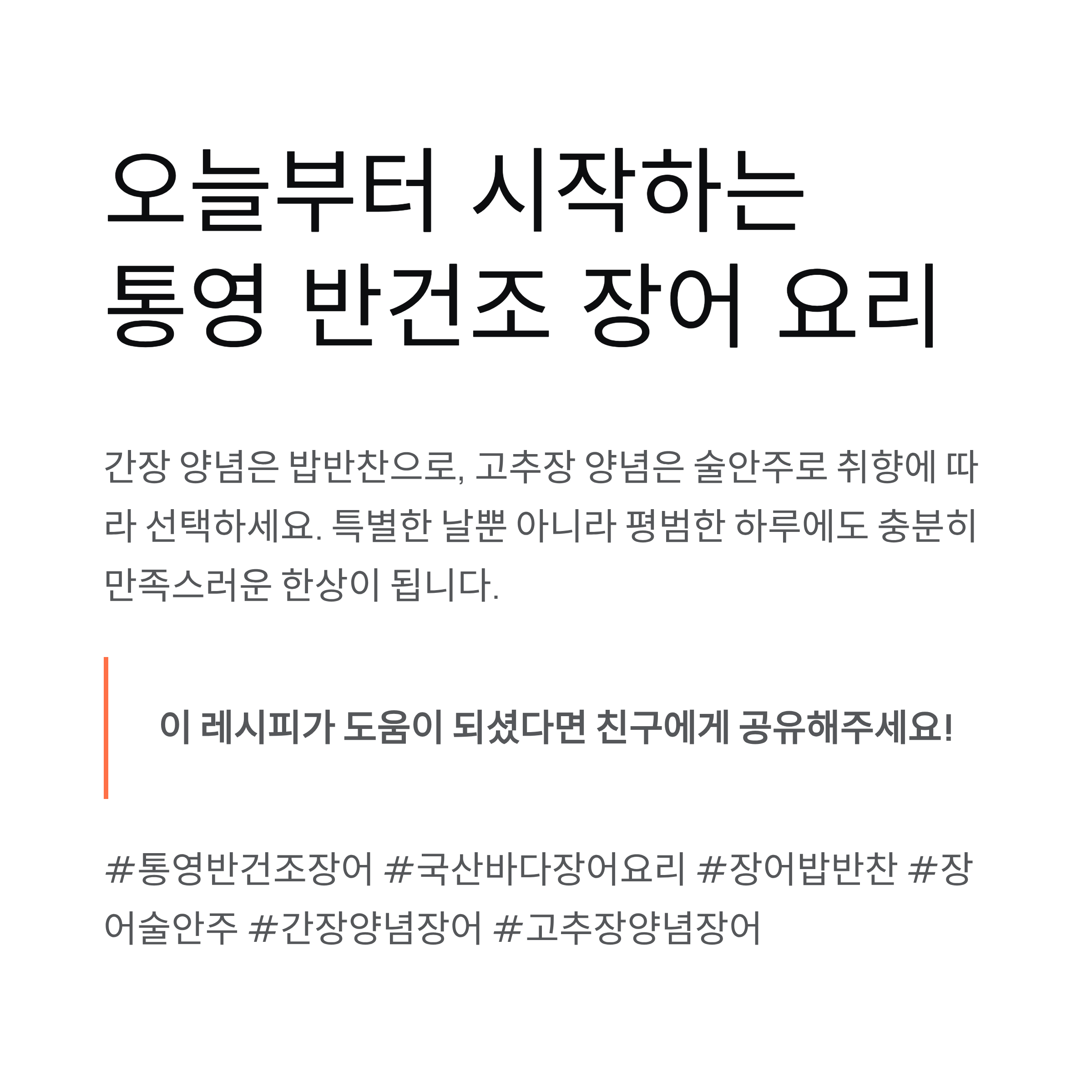 국산 통영 반건조 바다장어는 손질이 간단하고 풍미가 확실해 일상 식탁에도 부담 없이 올릴 수 있는 재료입니다. 간장 양념은 밥반찬으로, 고추장 양념은 술안주로 잘 맞으니 취향에 따라 선택해 조리해 보세요. 특별한 날뿐 아니라 평범한 하루에도 충분히 만족스러운 한상으로 완성됩니다.