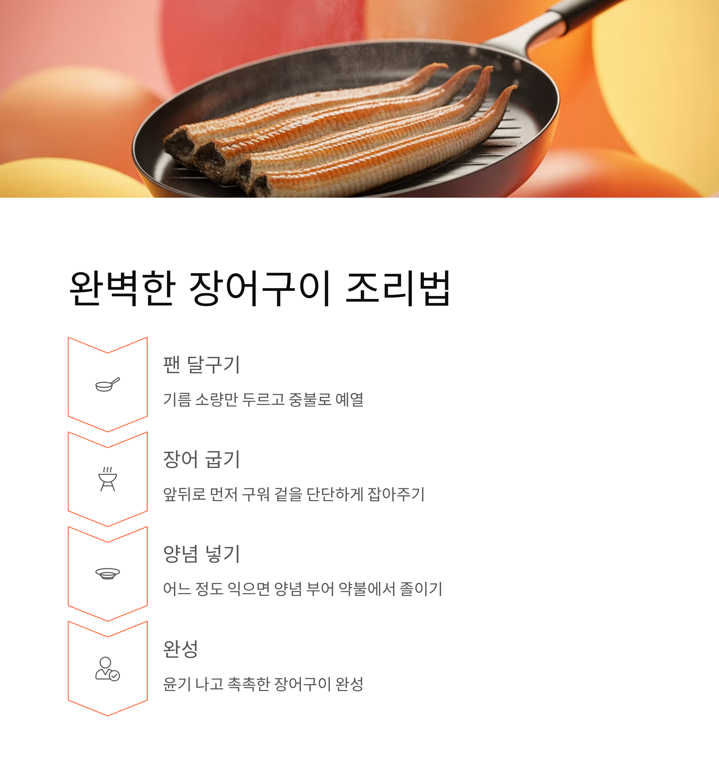 달군 팬에 기름을 아주 소량만 두르고 장어를 앞뒤로 먼저 구워 주세요. 이 과정이 겉을 단단하게 잡아 주어 풍미가 올라가요. 어느 정도 익으면 준비한 양념을 부어 약불에서 졸이듯 익히면 윤기가 돌면서 촉촉한 장어구이가 완성됩니다. 따끈한 밥과 함께 먹으면 다른 반찬이 필요 없을 정도로 만족도가 높아요.