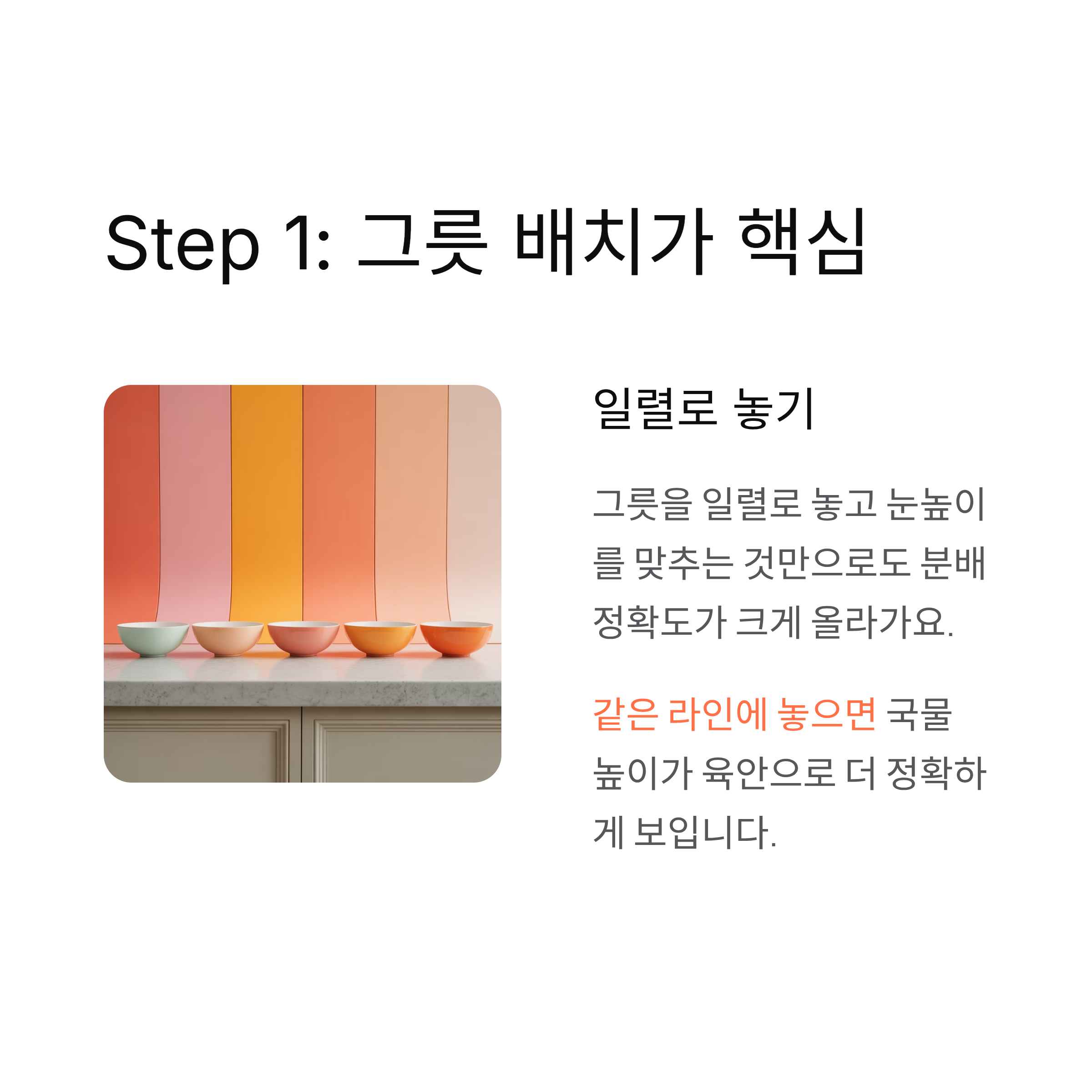 국물을 붓기 전, 그릇을 일렬로 놓고 눈높이를 맞추는 것만으로도 분배 정확도가 크게 올라가요. 같은 라인에 놓여 있으면 국물 높이가 육안으로 더 정확하게 보이기 때문에 비율 맞추기가 쉬워집니다.
