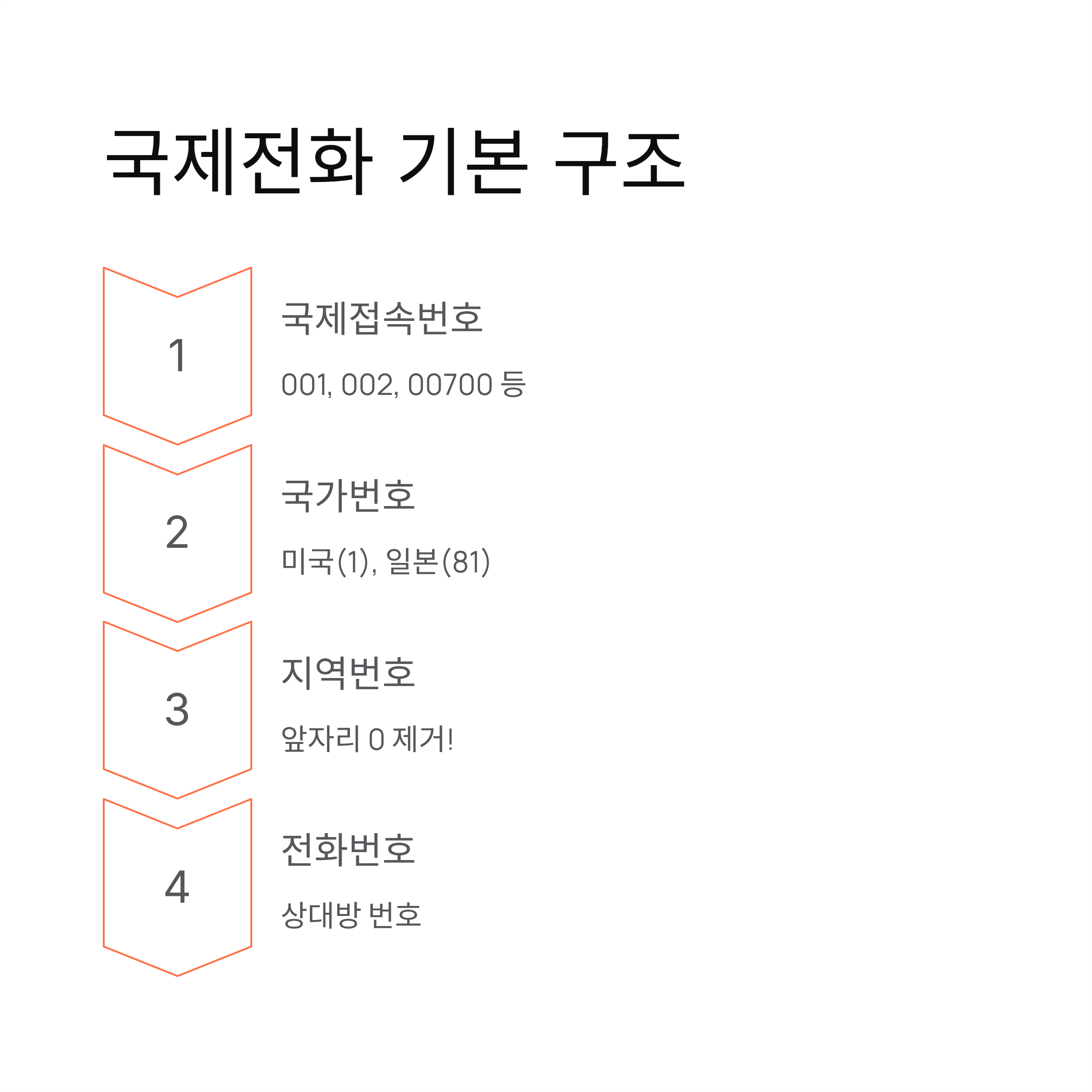 ① 국제전화 접속번호 + ② 국가번호 + ③ 지역번호(앞자리 0 제거) + ④ 전화번호