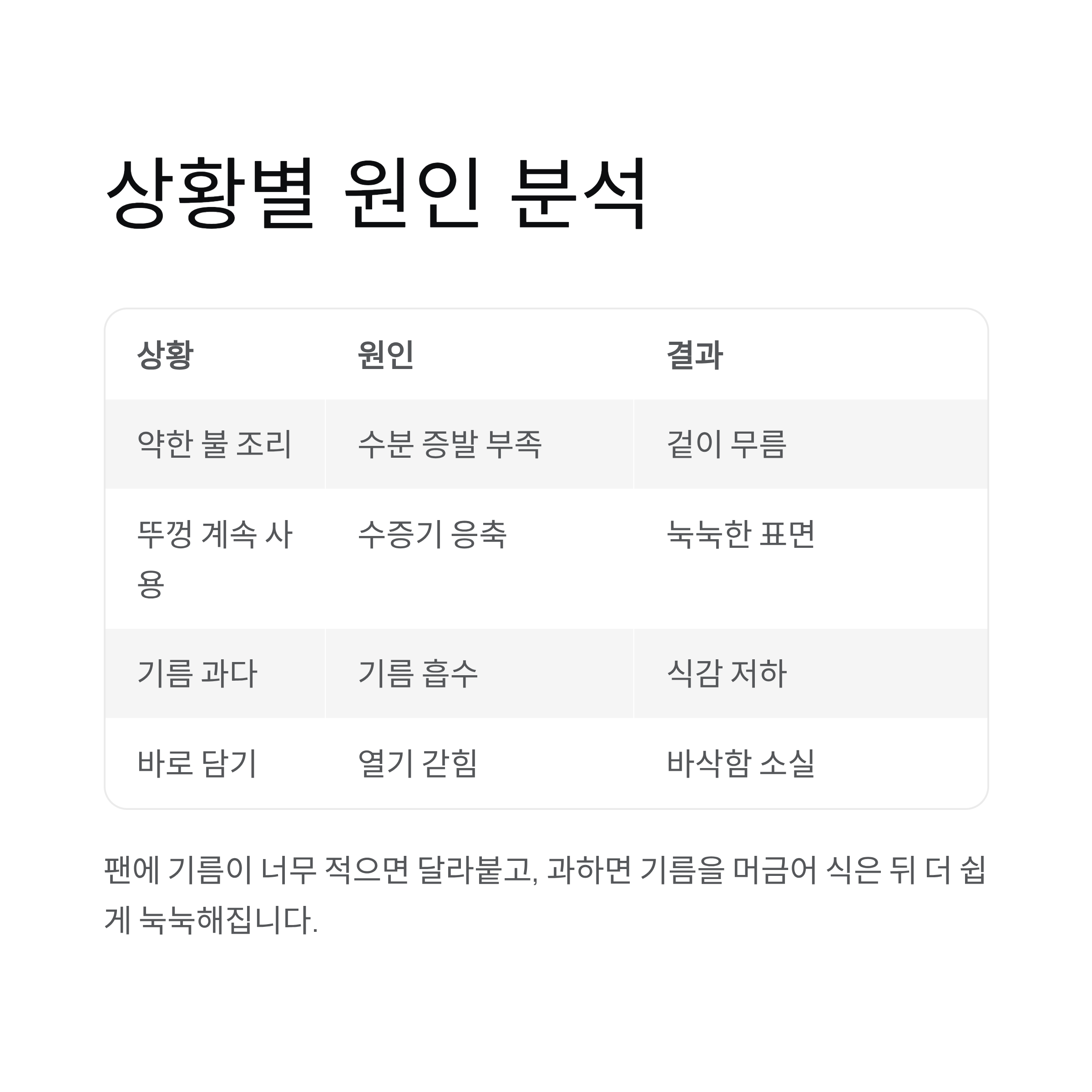 | 약한 불 조리 | 수분 증발 부족 | 겉이 무름 |