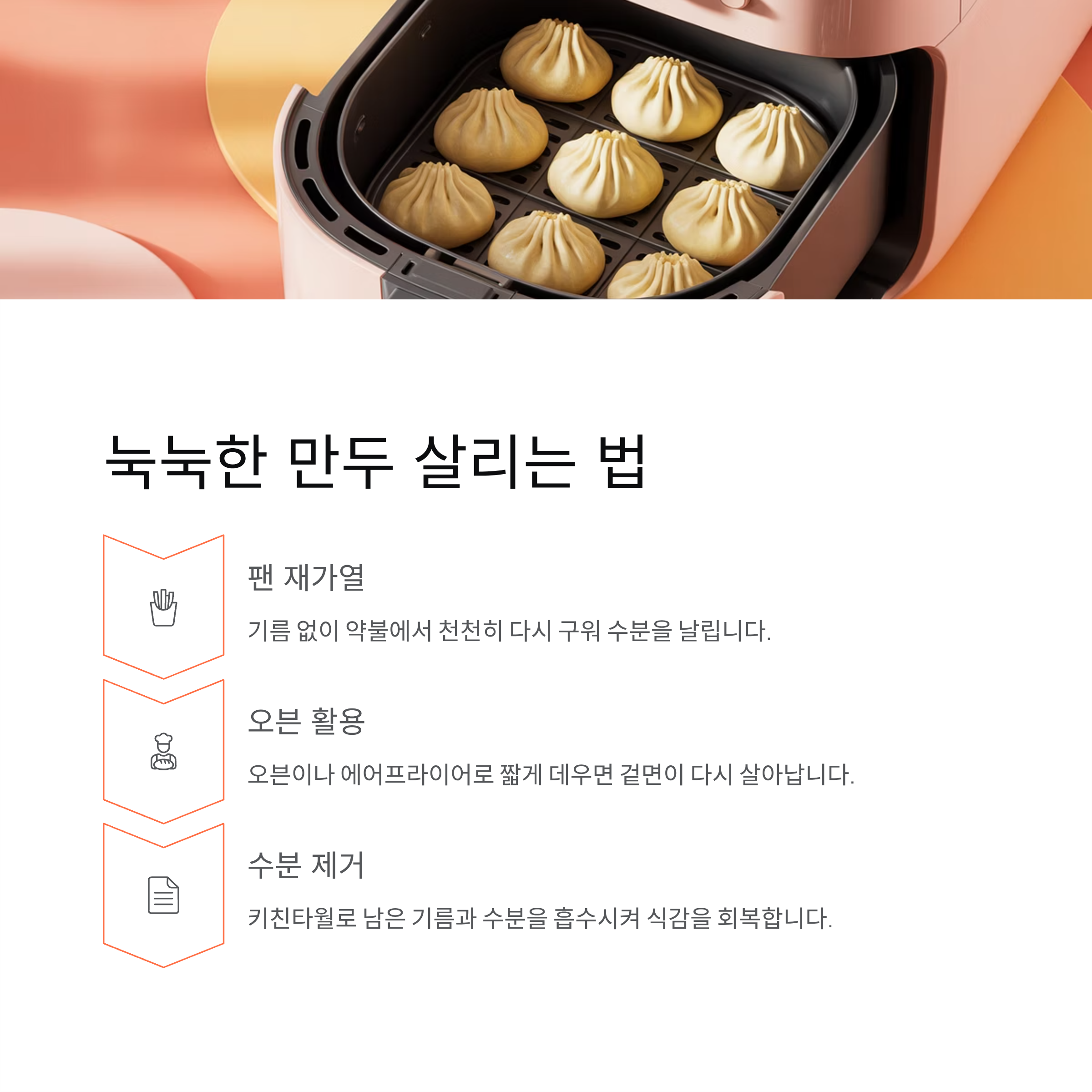 | 바로 담기 | 열기 갇힘 | 바삭함 소실 |