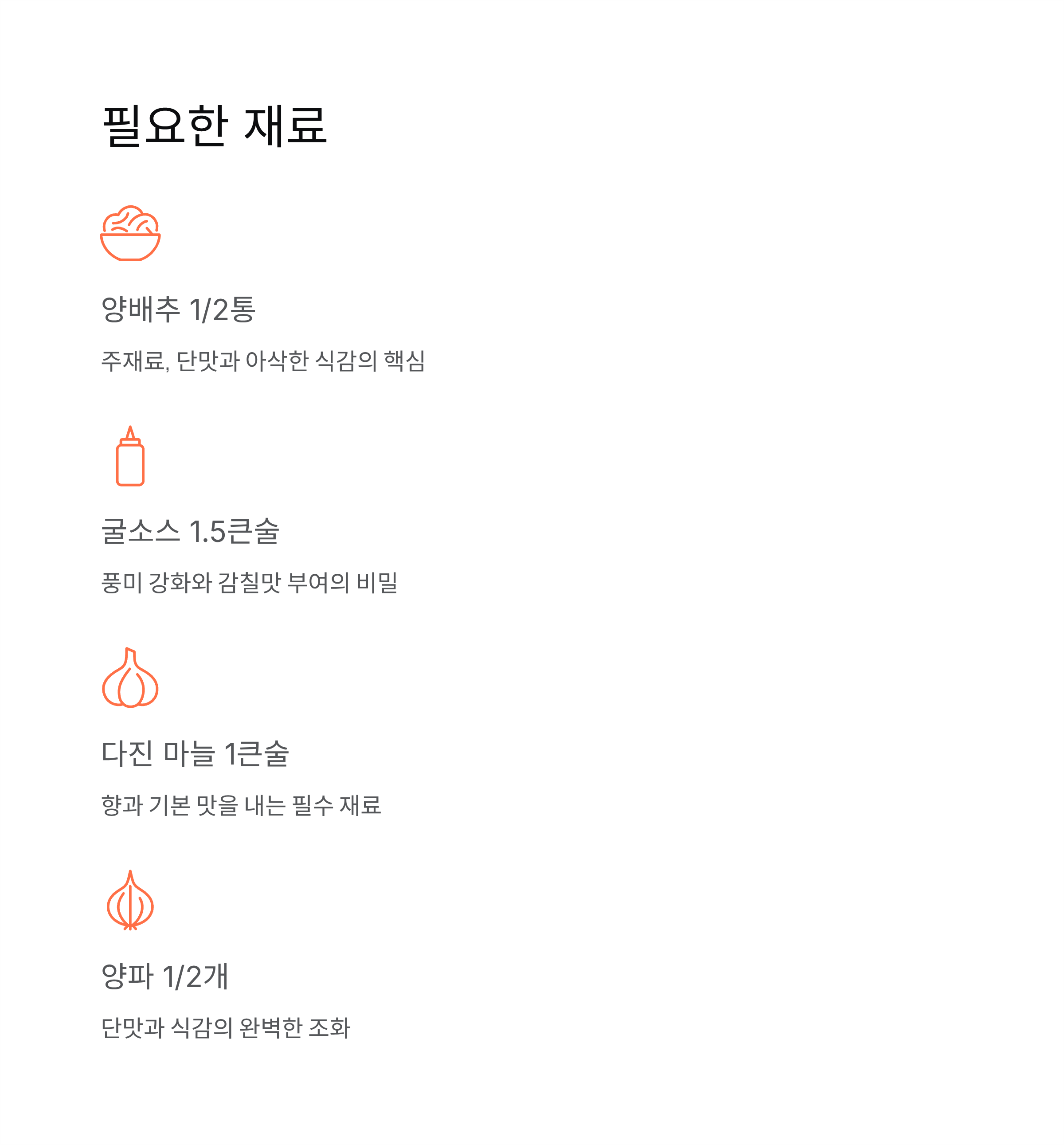 | 양배추 | 1/2통 | 주재료, 단맛과 아삭한 식감 |