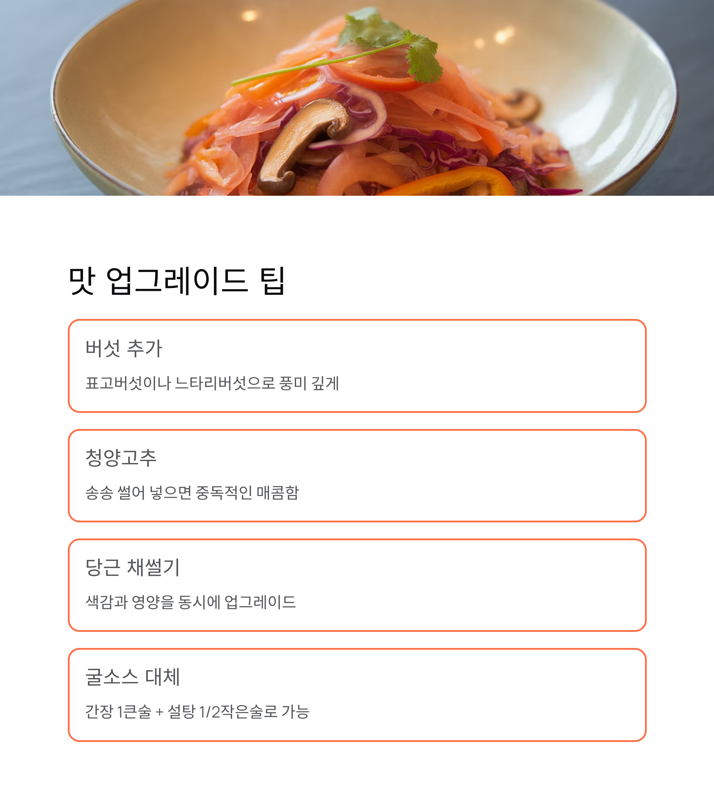 색감을 살리고 영양을 더하고 싶을 때는 당근을 가늘게 채 썰어 넣으세요. - 굴소스 대체 팁