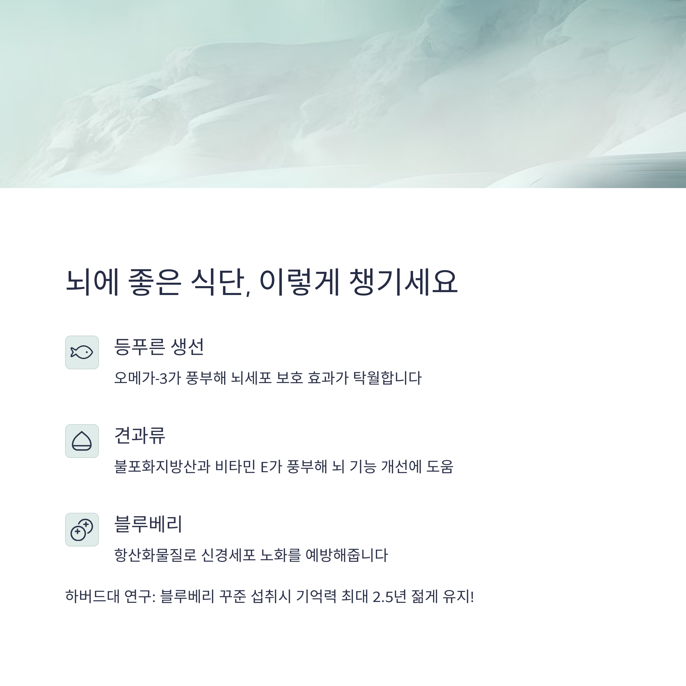 | 뇌 건강 식품 | 오메가-3 풍부한 등푸른 생선, 견과류 |